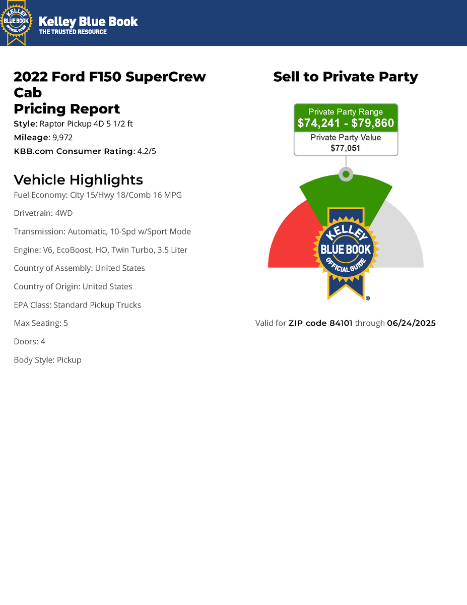 Equipment Group 801A Standard: Electronic Locking with 4.10 Axle Ratio; Leather Trim Seats with Heated 2nd Row; 17" Cast Aluminum Wheels; B&O Unleashed Sound System by Bang & Olufsen Radio; 3.5L V6 EcoBoost High Output Engine; Electronic 10-Speed Automatic Transmission; LT315/70R17 BSW A/T Tires; 7,300 lbs Payload Package GVWR,Moonroof and Tailgate: Twin Panel Moonroof; Power Tailgate,Raptor Exterior Graphics Package,Pro Power Onboard - 2KW,Partitioned Lockable Fold-Flat Storage,AppLink/Apple CarPlay/Android Auto smart device wireless mirroring,Hands-on cruise control,Lane departure prevention,Pre-Collision Assist with Automatic Emergency Braking (AEB) forward collision mitigation,Pedestrian impact prevention,Mobile hotspot internet access,Rear mounted camera,Rear collision mitigation,Adaptive Cruise Control with Traffic Jam Assist,Brake assist system,Cruise control with steering wheel mounted controls,Smart device and keyfob engine start control,Power open and close tailgate,Ventilated driver and front passenger seats,Connected Navigation integrated navigation system with voice activation,Heated driver and front passenger seats,Heated rear seats,Leather front seat upholstery,Primary monitor touchscreen,First and second-row sliding and tilting glass sunroof with express open/close activation sunshade,Driver seat power reclining, lumbar support, cushion tilt, fore/aft control and height adjustable control,Part and full-time 4WD,EcoBoost 3.5L V-6 port/direct injection, DOHC, variable valve control, twin turbo, regular unleaded, engine with 450HP,Front wireless smart device charging,SYNC 4 with Enhanced Voice Recognition (Alexa-Built-In) built-in virtual assistant,Driver attention alert,MyKey restricted driving mode,External keypad door lock control,Smart key with hands-free access and push button start,Automatic brake hold,Bluetooth wireless audio streaming,Pro Trailer Backup Assist vehicle and trailer reverse assist,Pro Trailer Hitch Assist automated vehicle to trailer hitching assist,Gage cluster display size: 12.00,Front mounted camera with washer,Right side camera,Pickup box camera,Left side camera,BLIS with Trailer Tow Coverage blind spot warning,Dual-zone front climate control,SYNC 4 with Enhanced Voice Recognition voice-activated climate control,Rock Crawl Mode off-road speed control,Directionally adaptive headlights,Ford Co-Pilot360 - Auto High Beam auto high-beam headlights,SecuriLock immobilizer,B&O Unleashed Sound System by Bang & Olufsen speakers,SYNC 4 handsfree wireless device connectivity,Trailer brake controller,Trailer sway control,External memory control