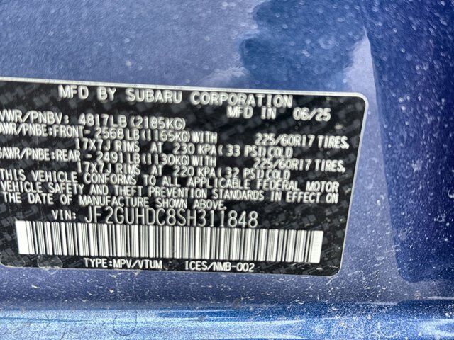 CARGO COVER -inc: Part number 65550FN00A,DAYBREAK BLUE PEARL,CROSSTREK MIRROR PACKAGE -inc: Auto-Dimming Mirror w/Compass & HomeLink Part number H501SFN000 Auto-Dimming Exterior Mirror w/Approach Light Part number J201SFN001,REAR BUMPER COVER -inc: Part number E771SFN000,BLACK CLOTH UPHOLSTERY,BSD/RCTA & ALL WTHR PKG & PWR DR. SEAT & PWR MOONRF -inc: automatic emergency steering system off switch BSD/RCTA detection indicator exterior power mirrors rear radar detection sensors and lane change assist Rear Cross-Traffic Alert (RCTA) System off and malfunction warning indicator and audible vehicle detection warning 10-Way Power Driver's Seat 2-way lumbar support Blind Spot Detection (BSD) All-Weather Package Heated Power Exterior Mirrors Dual-Mode Heated Front Seats Windshield De-Icer Wipers Power Moonroof tilt up and internal retracting w/auto-open/close and laminated UV and dark tint moonroof glass,All Wheel Drive,Power Steering,ABS,4-Wheel Disc Brakes,Brake Assist,Brake Actuated Limited Slip Differential,Aluminum Wheels,Tires - Front All-Season,Tires - Rear All-Season,Temporary Spare Tire,Power Mirror(s),Integrated Turn Signal Mirrors,Rear Defrost,Privacy Glass,Intermittent Wipers,Variable Speed Intermittent Wipers,Rear Spoiler,Power Door Locks,Daytime Running Lights,Automatic Headlights,Headlights-Auto-Leveling,LED Headlights,Automatic Highbeams,Fog Lamps,AM/FM Stereo,Satellite Radio,MP3 Capability,Bluetooth Connection,Auxiliary Audio Input,HD Radio,Smart Device Integration,Requires Subscription,MP3 Capability,Steering Wheel Audio Controls,Bluetooth Connection,Bucket Seats,Pass-Through Rear Seat,Rear Bench Seat,Adjustable Steering Wheel,Trip Computer,Power Windows,WiFi Hotspot,Remote Trunk Release,Keyless Entry,Power Door Locks,Keyless Start,Keyless Entry,Power Door Locks,Cruise Control,Adaptive Cruise Control,Climate Control,Multi-Zone A/C,A/C,Cloth Seats,Driver Vanity Mirror,Passenger Vanity Mirror,Driver Illuminated Vanity Mirror,Passenger Illuminated Visor Mirror,Floor Mats,Keyless Start,Smart Device Integration,Power Windows,Power Door Locks,Trip Computer,Security System,Immobilizer,Cruise Control Steering Assist,Traction Control,Stability Control,Traction Control,Front Side Air Bag,Lane Departure Warning,Lane Keeping Assist,Lane Departure Warning,Front Collision Mitigation,Driver Monitoring,Telematics,Requires Subscription,Tire Pressure Monitor,Driver Air Bag,Passenger Air Bag,Front Head Air Bag,Rear Head Air Bag,Passenger Air Bag Sensor,Knee Air Bag,Child Safety Locks,Back-Up Camera