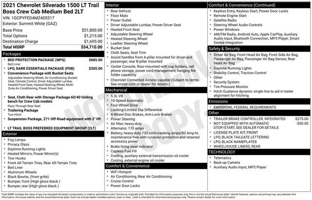 2021 Chevrolet Silverado 1500 LT Trail Boss Summit White 4WD 10-Speed Automatic EcoTec3 5.3L V8