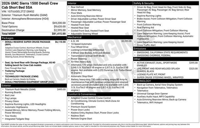 2026 GMC Sierra 1500 Denali 4D Crew Cab Titanium Rush Metallic EcoTec3 6.2L V8 4WD --- Please note that the final selling price does not include tax, tag, title, documentation fees, dealer-installed options, or pricing adjustments due to market demand. Financing through GM Financial is required for all discounts to be applied. Special finance offers may not be combined with some factory incentives. While we strive for accuracy, errors may occur, so please verify all information with a customer service representative. For the most accurate pricing, call us at (801) 265-1511 or visit our dealership in person. Prices and payments are subject to change based on manufacturer incentives. ... Sale Price may include dealer discount, $1750 - Buick & GMC Consumer Cash Program $3500 - GM Trade In Allowance Program $500 - GM Bonus Cash - Price includes $2,000 Down Payment Assistance. Must Finance with GM Financial –