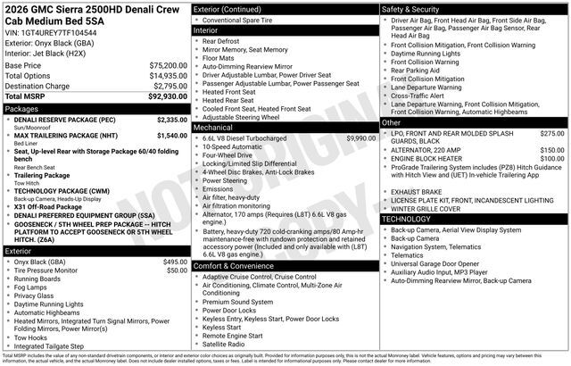 2026 GMC Sierra 2500HD Denali 4D Crew Cab Onyx Black Duramax 6.6L V8 Turbodiesel 4WD --- Please note that the final selling price does not include tax, tag, title, documentation fees, dealer-installed options, or pricing adjustments due to market demand. Financing through GM Financial is required for all discounts to be applied. Special finance offers may not be combined with some factory incentives. While we strive for accuracy, errors may occur, so please verify all information with a customer service representative. For the most accurate pricing, call us at (801) 265-1511 or visit our dealership in person. Prices and payments are subject to change based on manufacturer incentives. ... Sale Price may include dealer discount, $500 - Buick & GMC Consumer Cash Program - Price includes $2,000 Down Payment Assistance. Must Finance with GM Financial – - Price includes $1,500 trade in allowance program for customers that own a 2019 or newer passenger car or truck with less than 80,000 miles and trade in their vehicle towards the purchase of a new 2025-2026 Buick or GMC. Some restrictions may apply. Contact dealer for details –