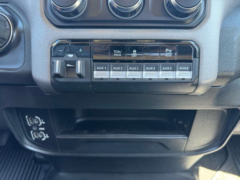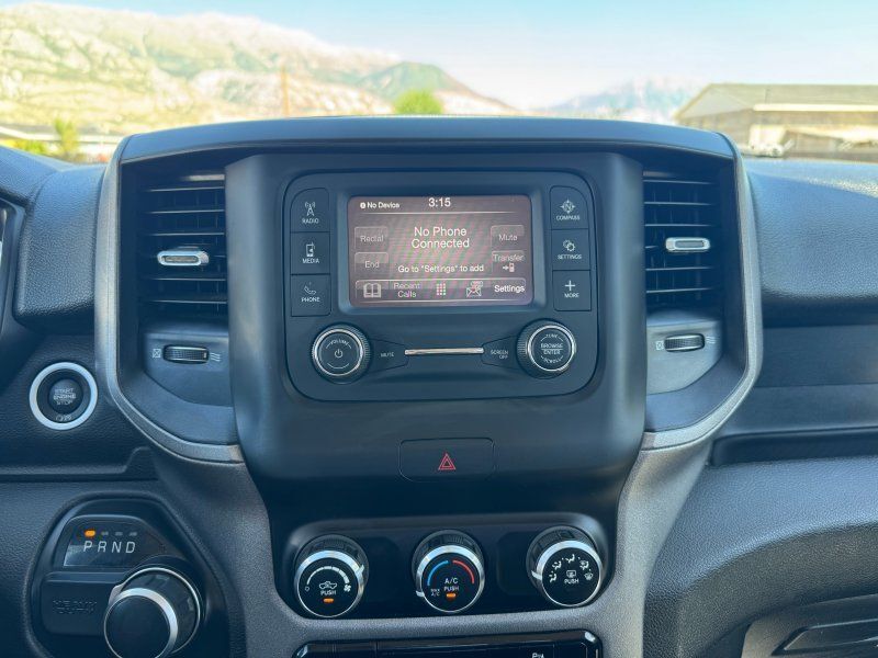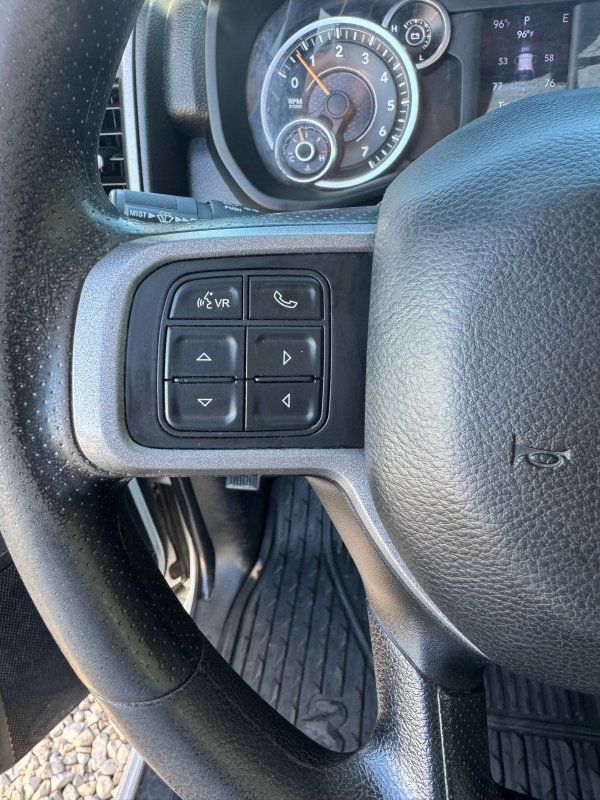 Bluetooth,Backup Camera,Driver seat manual adjustments: reclining 4,Front headrests: adjustable 2,Front seat type: 40-20-40 split bench,Passenger seat manual adjustments: reclining 4,Upholstery: vinyl,ABS: 4-wheel,Brake drying: ,Braking assist: ,Electronic brakeforce distribution: ,Emergency braking preparation: ,Front brake diameter: 14.2,Front brake type: ventilated disc,Front brake width: 1.54,Power brakes: ,Rear brake diameter: 14.1,Rear brake type: ventilated disc,Rear brake width: 1.34,Alternator: 180 amps,Auxiliary oil cooler: ,Battery: maintenance-free,Battery rating: 730 CCA,Battery saver: ,Emissions: 50 state,Daytime running lights: ,Headlights: auto delay off auto on/off, halogen, quad headlights,Camera system: rearview,Child seat anchors: LATCH system,Crumple zones: front,Rearview monitor: in dash,Airbag deactivation: occupant sensing passenger,Front airbags: dual,Side airbags: front,Side curtain airbags: front,Side mirror adjustments: manual manual folding, manual telescoping,Towing mirrors: ,Front wipers: variable intermittent,Rear privacy glass: ,Solar-tinted glass: ,Anti-theft system: vehicle immobilizer,Emergency locking retractors: front,Front seatbelts: 3-point,Seatbelt force limiters: front,Seatbelt pretensioners: front,Seatbelt warning sensor: front,4WD selector: manual hi-lo,4WD type: part time,Axle ratio: 3.73,Limited slip differential: rear,Front shock type: gas,Front spring type: coil,Front stabilizer bar: ,Front suspension classification: solid live axle,Front suspension type: multi-link,Rear shock type: gas,Rear spring type: leaf,Rear suspension classification: solid live axle,Rear suspension type: multi-leaf,Suspension control: frequency selective,Electronic messaging assistance: voice operated with read function,Hands-free phone call integration: voice operated,Wireless data link: Bluetooth,Antenna type: mast,Auxiliary audio input: Bluetooth USB, jack,Radio: AM/FM touch screen display, voice operated,Radio data system: ,Speed sensitive volume control: ,Total speakers: 4,Spare tire mount location: underbody,Spare tire size: full-size,Spare wheel type: steel,Tire Pressure Monitoring System: ,Tire type: all season,Wheels: steel,Clock: ,Compass: ,Digital odometer: ,External temperature display: ,Fuel economy display: MPG range,Gauge: tachometer,Instrument cluster screen size: 3.5 in.,Multi-function display: ,Powertrain hour meter: ,Trip odometer: ,Warnings and reminders: low fuel level low oil level, maintenance due,Front air conditioning: ,Front air conditioning zones: single,Armrests: front center,Cargo area floor mat: rubber/vinyl,Door sill trim: scuff plate,Floor material: rubber/vinyl,Steering wheel trim: urethane,Active grille shutters: ,Door handle color: black,Front bumper color: black,Grille color: black black surround,Headlight bezel color: chrome,License plate bracket: front,Mirror color: black,Pickup bed light: ,Rear bumper color: black,Tailgate: removable,Window trim: black,Auxiliary transmission fluid cooler: ,Pickup bed cargo management: tie-down anchors,Tow hooks: front,Tow/Haul mode: ,Trailer hitch: Class V,Trailer wiring: 4-pin 7-pin,Assist handle: front,Cruise control: ,Cupholders: front,Power outlet(s): 12V front,Power steering: ,Push-button start: ,Reading lights: front,Rearview mirror: manual day/night,Steering wheel: tilt,Steering wheel mounted controls: cruise control multi-function, phone, voice control,Storage: accessory hook door pockets,Vanity mirrors: passenger,Infotainment: Uconnect,Infotainment screen size: 5 in.,Hill holder control: ,Roll stability control: ,Stability control: ,Traction control: ,Trailer stability control: