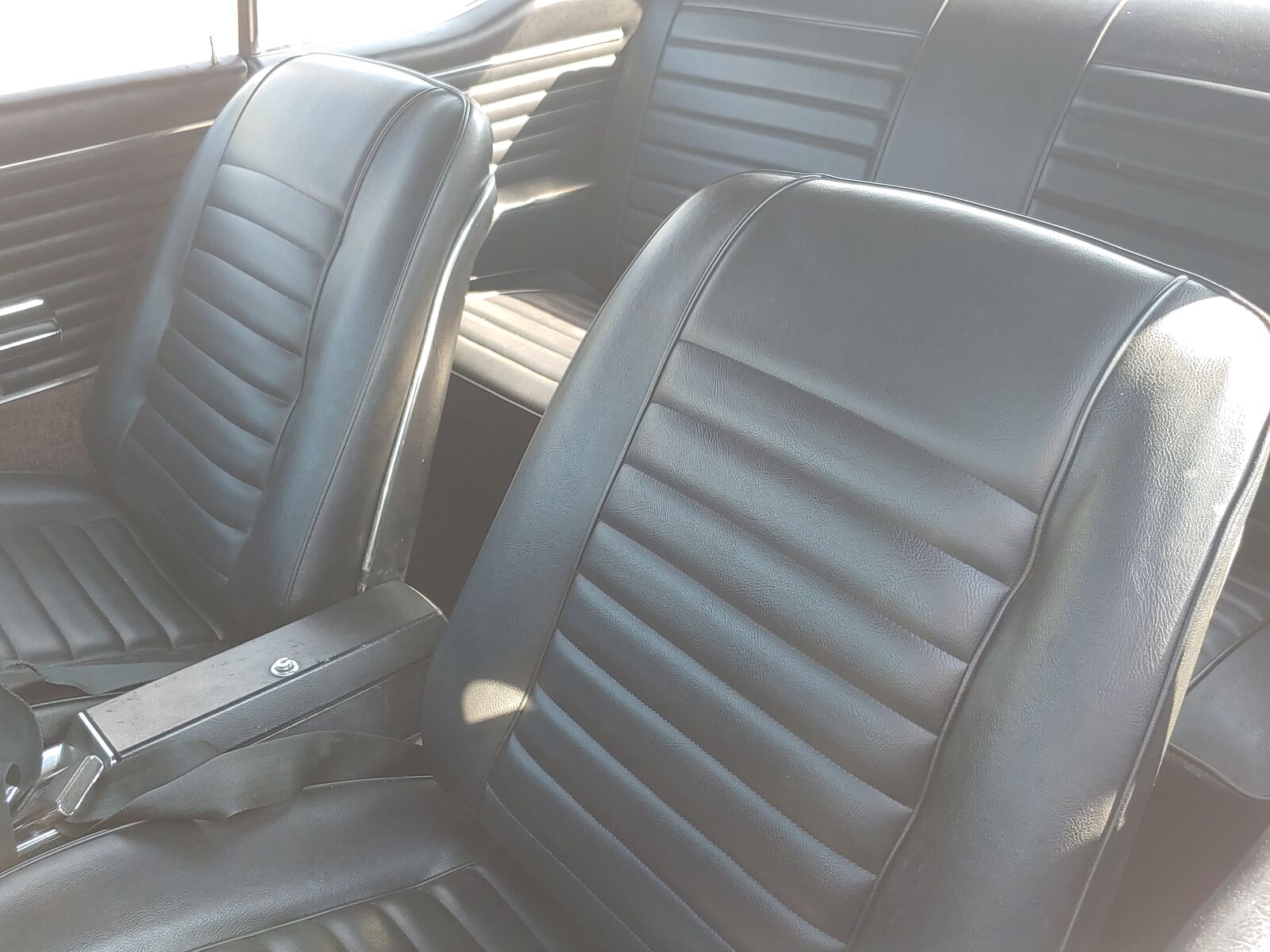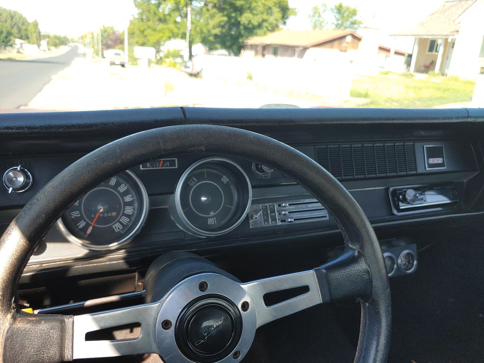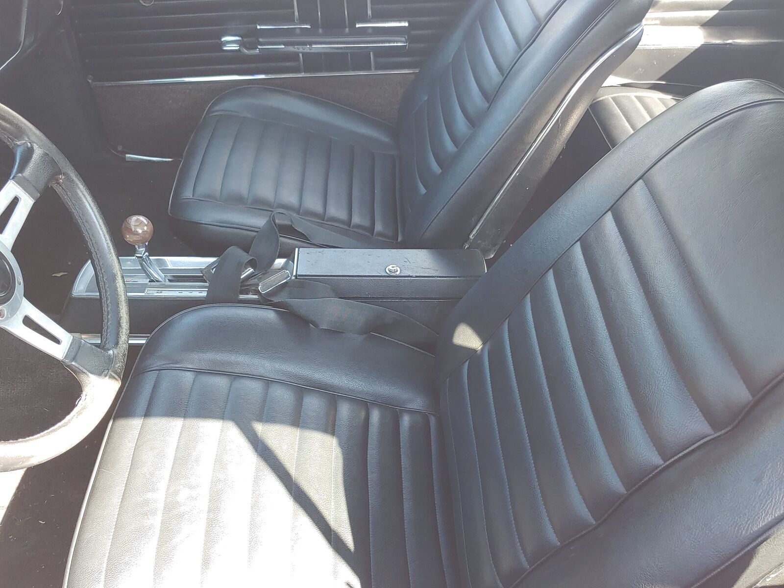 Black. All seats are in great condition. Good headliner. Grant steering wheel. The dash has some cracks.