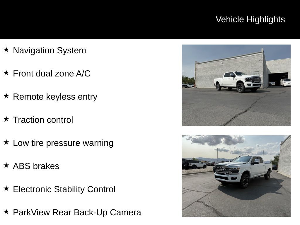 2026 Ram 2500 LONGHORN Bright White Clearcoat 4D Crew Cab 6.7L I6 4WD ABS brakes, Active Cruise Control, Alloy wheels, Compass, Electronic Stability Control, Front dual zone A/C, Heated door mirrors, Heated front seats, Heated rear seats, Illuminated entry, Low tire pressure warning, Navigation System, ParkView Rear Back-Up Camera, Remote keyless entry, Traction control. Price includes: $1000 - 2026 National Bonus Cash . Exp. 03/02/2026