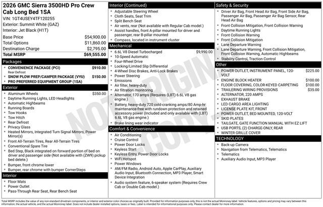 2026 GMC Sierra 3500HD Pro 4D Crew Cab Summit White Duramax 6.6L V8 Turbodiesel 4WD --- Please note that the final selling price does not include tax, tag, title, documentation fees, dealer-installed options, or pricing adjustments due to market demand. Financing through GM Financial is required for all discounts to be applied. Special finance offers may not be combined with some factory incentives. While we strive for accuracy, errors may occur, so please verify all information with a customer service representative. For the most accurate pricing, call us at (801) 265-1511 or visit our dealership in person. Prices and payments are subject to change based on manufacturer incentives. ... Sale Price may include dealer discount, $500 - Buick & GMC Consumer Cash Program - Price includes $2,000 Down Payment Assistance. Must Finance with GM Financial – - Price includes $1,500 trade in allowance program for customers that own a 2019 or newer passenger car or truck with less than 80,000 miles and trade in their vehicle towards the purchase of a new 2025-2026 Buick or GMC. Some restrictions may apply. Contact dealer for details –
