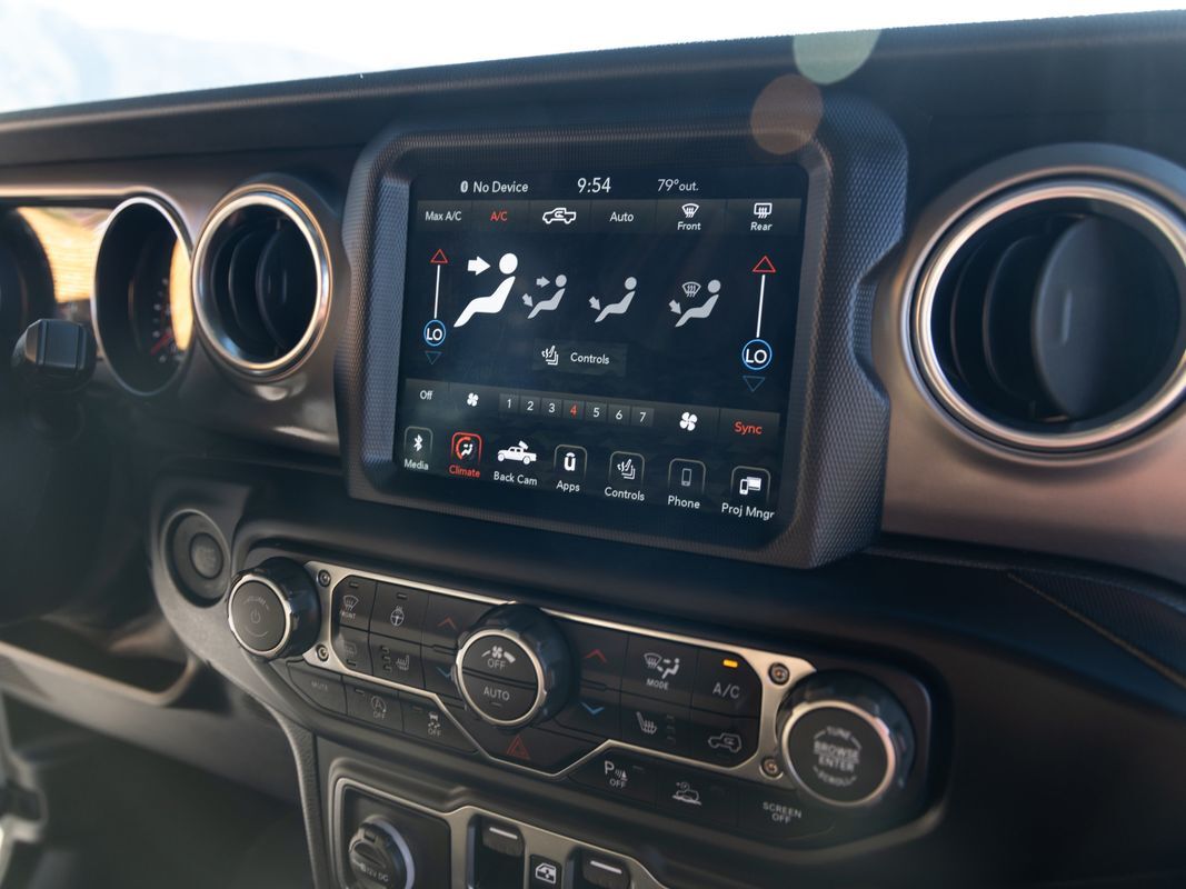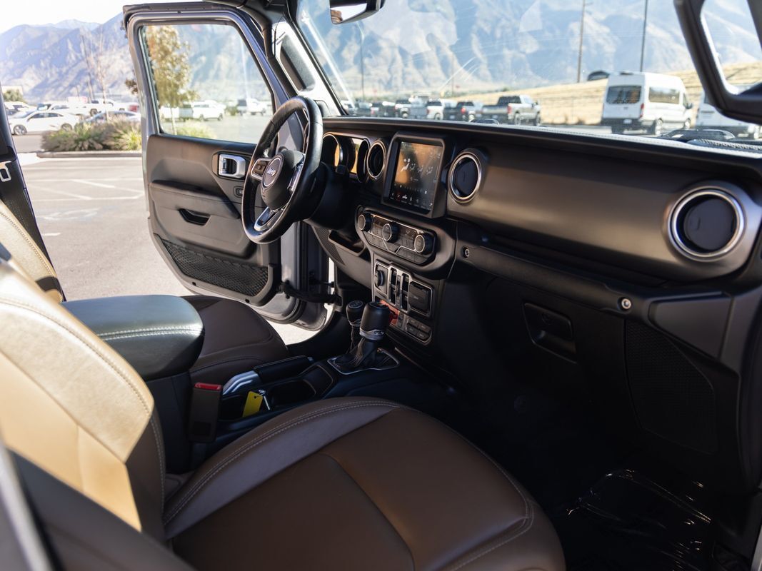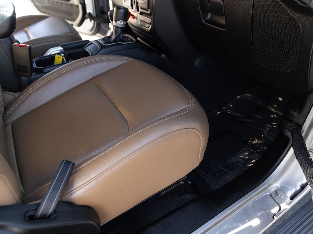 Leather Seats,Bluetooth,Backup Camera,Removable roof: soft top,Driver seat manual adjustments: height lumbar, reclining, 6,Front headrests: adjustable 2,Front seat type: bucket,Passenger seat manual adjustments: reclining 4,Rear headrests: adjustable 3,Rear seat folding: folds up split,Rear seat type: 60-40 split bench,Upholstery: premium cloth,Upholstery accents: contrast stitching,ABS: 4-wheel,Braking assist: ,Electronic brakeforce distribution: ,Front brake diameter: 12.9,Front brake type: ventilated disc,Front brake width: 1.1,Power brakes: ,Rear brake diameter: 13.6,Rear brake type: ventilated disc,Rear brake width: 0.86,Alternator: 220 amps,Auto start/stop: ,Auxiliary oil cooler: ,Battery: maintenance-free,Battery rating: 650 CCA,Battery saver: ,Emissions: 50 state,Daytime running lights: ,Exterior entry lights: approach lamps,Front fog lights: ,Headlights: auto delay off auto on/off, halogen,Camera system: rearview,Child safety door locks: ,Child seat anchors: LATCH system,Crumple zones: front rear,Rearview monitor: in dash,Airbag deactivation: occupant sensing passenger,Front airbags: dual,Side airbags: front,Side mirror adjustments: manual folding power,Side mirrors: heated,Front wipers: variable intermittent,Power windows: safety reverse,Rear privacy glass: ,Solar-tinted glass: ,Tinted glass: front driver and passenger,Anti-theft system: alarm vehicle immobilizer,Power door locks: auto-locking,Steering ratio: 13.3,Turns lock-to-lock: 3.2,Emergency locking retractors: front rear,Front seatbelts: 3-point,Rear seatbelts: 3-point,Seatbelt force limiters: front,Seatbelt pretensioners: front,Seatbelt warning sensor: front,4WD selector: manual hi-lo,4WD type: part time,Axle ratio: 4.10,Drive mode selector: ,Locking differential: front rear,Front shock type: monotube,Front spring type: coil,Front stabilizer bar: ,Front suspension classification: solid live axle,Front suspension type: multi-link,Rear shock type: monotube,Rear spring type: coil,Rear stabilizer bar: ,Rear suspension classification: solid live axle,Rear suspension type: trailing arms,Tuned suspension: off-road,Driver assistance app: roadside assistance,Electronic messaging assistance: voice operated with read function,Phone: voice operated,Wireless data link: Bluetooth,Antenna type: diversity mast,Auxiliary audio input: Bluetooth USB, iPod/iPhone, jack, memory card slot,Radio: AM/FM touch screen display, voice operated,Radio data system: ,Satellite radio: SiriusXM,Speed sensitive volume control: ,Total speakers: 8,Spare tire mount location: underbody,Spare tire size: full-size,Spare wheel type: steel,Tire Pressure Monitoring System: ,Tire type: all terrain,Wheels: painted aluminum,Clock: ,Compass: ,Customizable instrument cluster: ,Digital odometer: ,External temperature display: ,Fuel economy display: MPG range,Gauge: tachometer,Instrument cluster screen size: 7 in.,Multi-function display: ,Trip odometer: ,Warnings and reminders: coolant temperature warning lamp failure, low fuel level, low oil pressure,Air filtration: ,Front air conditioning: automatic climate control,Front air conditioning zones: dual,Rear vents: second row,Armrests: rear center with cupholders rear folding,Dash trim: simulated alloy,Door trim: simulated alloy,Floor mat material: carpet,Floor material: carpet,Floor mats: front rear,Parking brake trim: urethane,Shift knob trim: urethane,Steering wheel trim: leather,Bumper detail: rear step,Door handle color: black,Fender lip moldings: black,Front bumper color: black,Grille color: body-color,Mirror color: black,Pickup bed light: ,Rear bumper color: black,Running board color: black,Running boards: ,Skid plate(s): front powertrain, rear,Tailgate: power locking,Window trim: black,Pickup bed cargo management: tie-down anchors,Tow hooks: front rear,Trailer hitch: bumper hitch,Trailer wiring: 4-pin 7-pin,Ambient lighting: ,Assist handle: front rear,Center console: front console with armrest and storage locking,Courtesy lights: door,Cruise control: ,Cupholders: front illuminated, rear,Footwell lights: ,Multi-function remote: keyless entry panic alarm,One-touch windows: 2,Power outlet(s): 115V front 12V front,Power steering: ,Power windows: lockout button,Push-button start: ,Reading lights: front rear,Rearview mirror: manual day/night,Steering wheel: tilt and telescopic,Steering wheel mounted controls: audio cruise control, multi-function, phone, voice control,Storage: accessory hook door pockets, front seatback,Tool kit: ,Universal remote transmitter: garage door opener,Vanity mirrors: dual illuminating,Infotainment: Uconnect,Infotainment screen size: 7 in.,Smartphone integration: Android Auto Apple CarPlay,Hill holder control: ,Roll stability control: ,Stability control: ,Traction control: ,Trailer stability control: