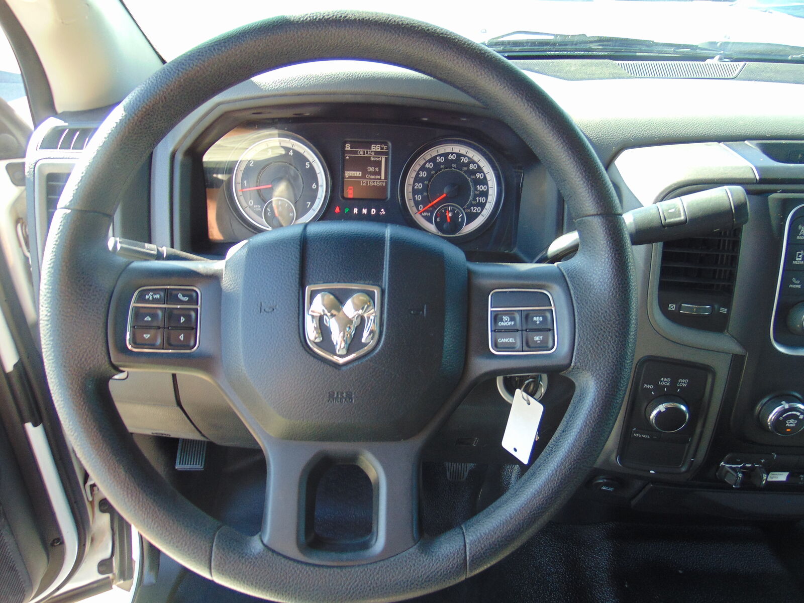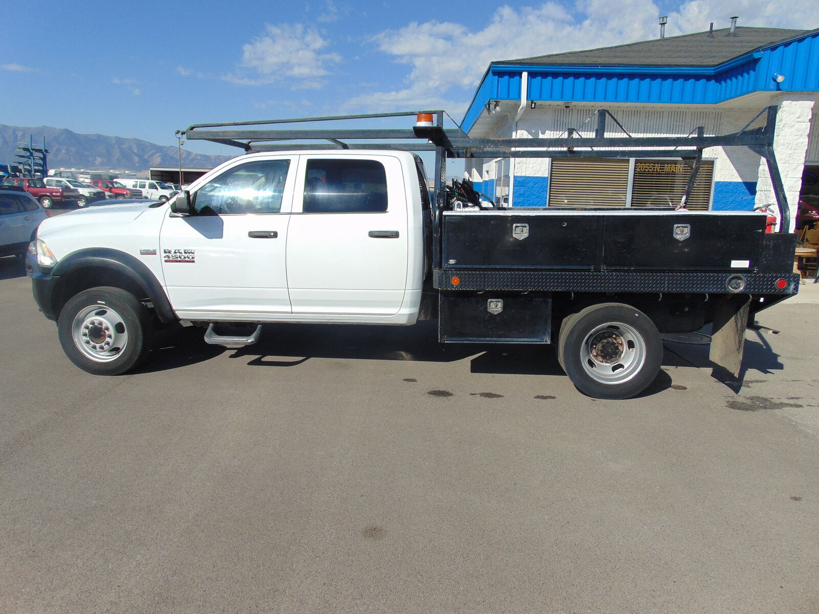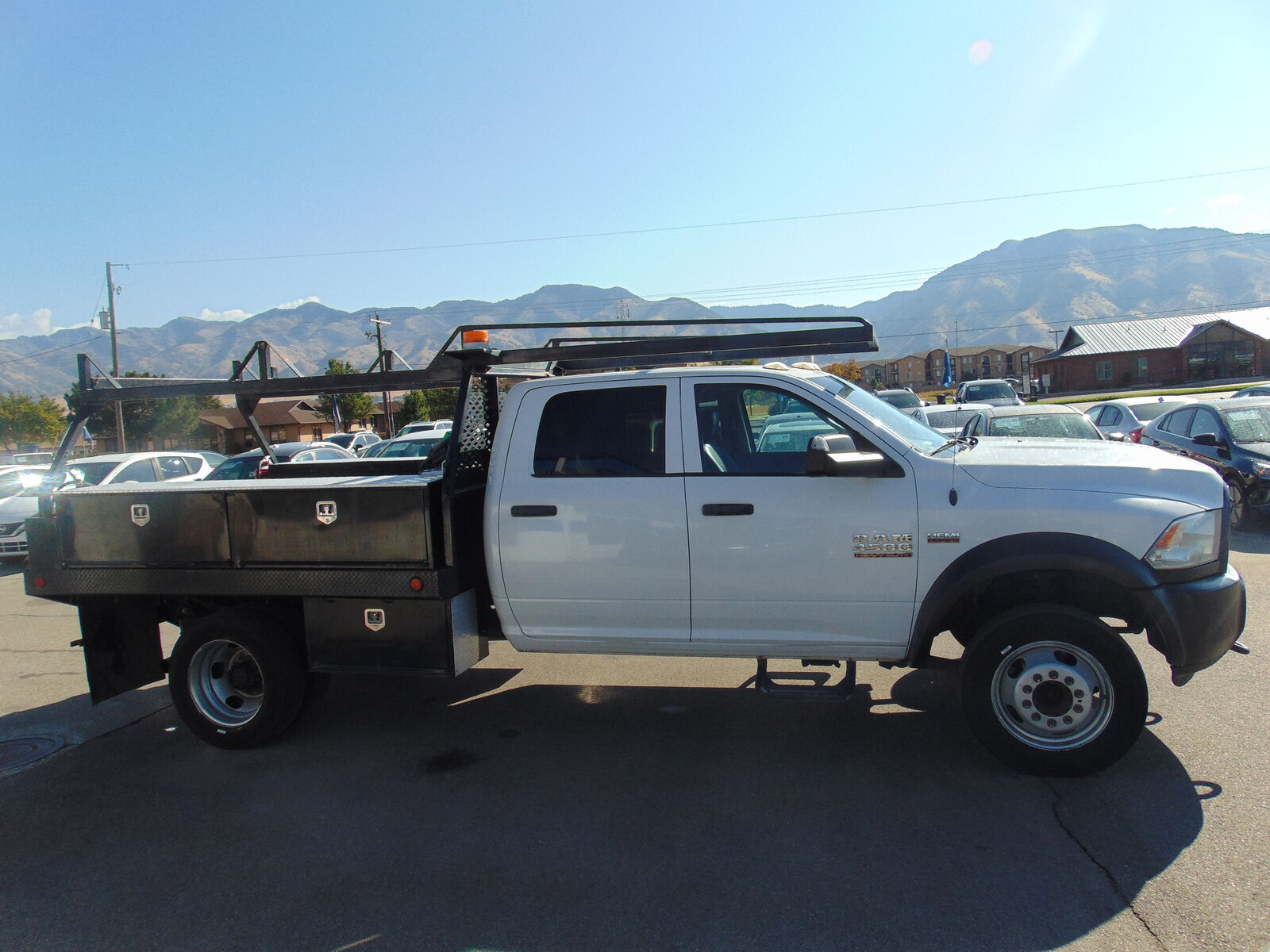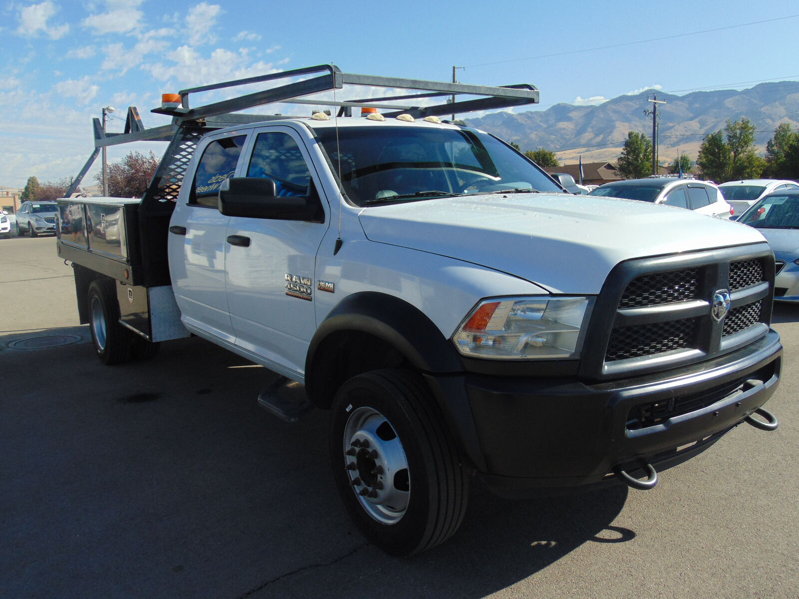 CLEAN CARFAX AND NO ACCIDENTS REPORTED ON THIS 2016 RAM 4500 HD CREW CAB, FLAT BED, DUAL REAR WHEELS, ELECTRIC SHIFT 4X4, WITH THE 6.4L V8 HEMI MOTOR, AISIN AS66RC AUTOMATIC TRANSMISSION, 173.4 INCH WHEELBASE, 4.44 AXLE RATIO WITH ANTI SPIN REAR DIFF, 16500 GVW RATING, 52 GALLON FUEL TANK, AND 121,848 MILES. THIS RAM COMES EQUIPPED WITH GRAY VINYL SEATS, 6 PASSENGER SEATING, VINYL FLOOR, POWER WINDOWS, LOCKS, AND MIRRORS, TILT, CRUISE, A/C, AM/FM STEREO, USB/AUX. PORTS, BLUETOOTH, FACTORY TRAILER BRAKE CONTROLLER, TOW PACKAGE, LADDER RACK, STROBE LIGHT, DIESEL FUEL TANK W/PUMP, STEEL FLATBED W/BINS, AND MUCH MORE!! THIS RAM IS IN VERY GOOD CONDITION INSIDE AND OUT!! IT IS ON A CLEAN TITLE AND ACTUAL MILES.
