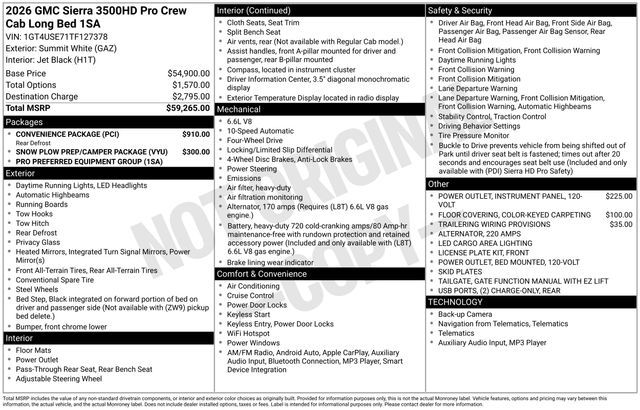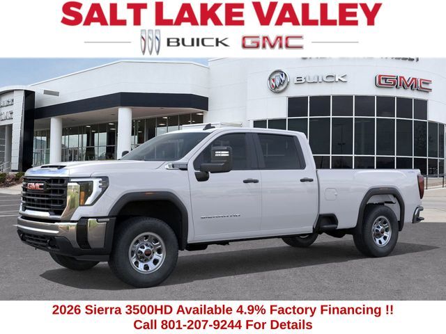 2026 GMC Sierra 3500HD Pro 4D Crew Cab Summit White 6.6L V8 4WD --- Please note that the final selling price does not include tax, tag, title, documentation fees, dealer-installed options, or pricing adjustments due to market demand. Financing through GM Financial is required for all discounts to be applied. Special finance offers may not be combined with some factory incentives. While we strive for accuracy, errors may occur, so please verify all information with a customer service representative. For the most accurate pricing, call us at (801) 265-1511 or visit our dealership in person. Prices and payments are subject to change based on manufacturer incentives. ... Sale Price may include dealer discount, $1000 - Buick & GMC Consumer Cash Program