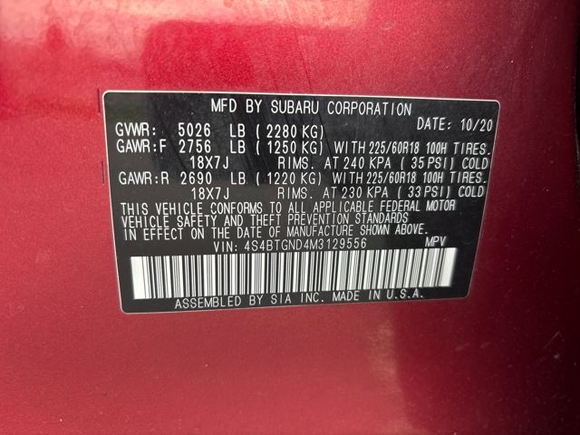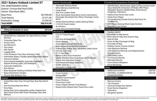2021 Subaru Outback Limited XT Crimson Red Pearl AWD CVT Lineartronic 2.4L DOHC 23/30 City/Highway MPG