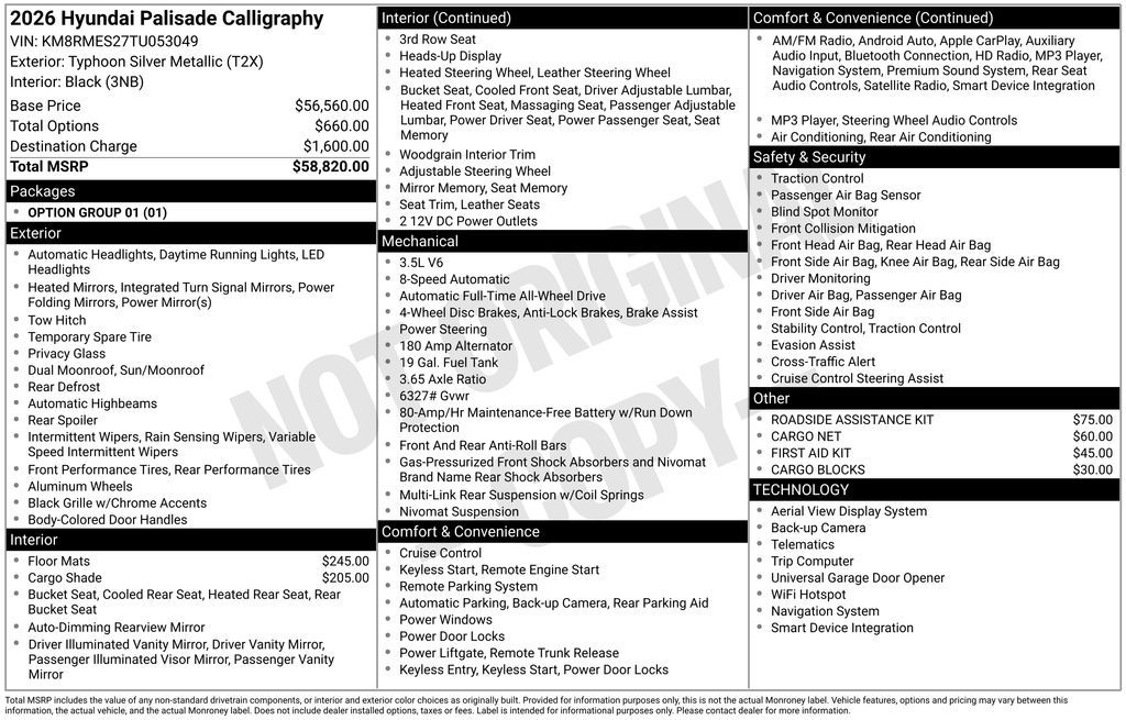 Typhoon Silver Metallic 2026 Hyundai Palisade Calligraphy AWD 8-Speed Automatic V6 Price includes the following incentives, not all customers will qualify. See dealer for details. : $1000 - Hyundai HMF Dealer Choice : $1000 discount and 5.39% APR for 24 months. $44.05 per $1000 financed. Available to well qualified buyers who finance through Hyundai Motor Finance. H704. Exp. 03/31/2026 $2000 - Sales Event Cash. Exp. 03/31/2026