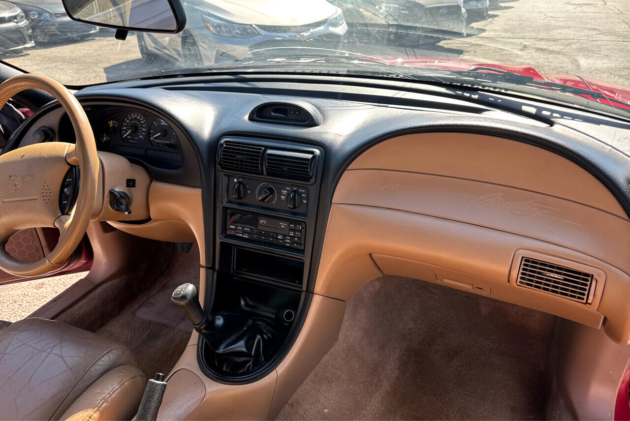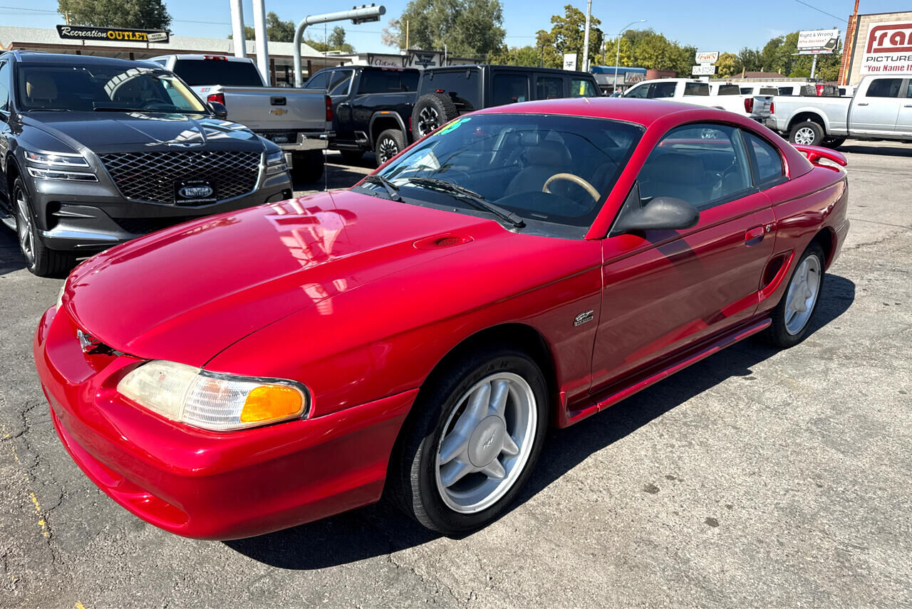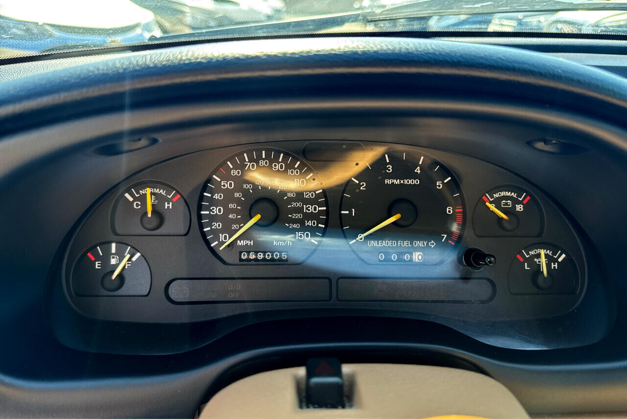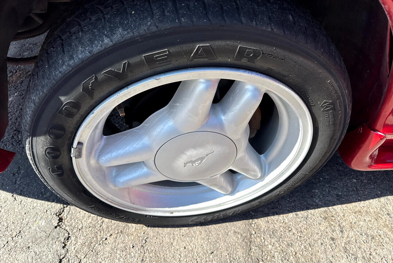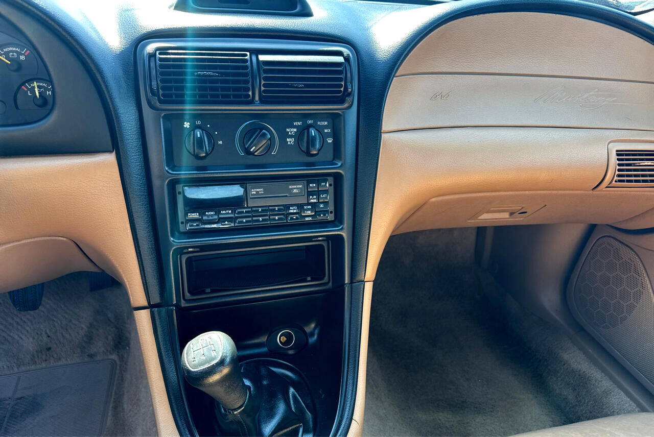 ASTERISK (*) INDICATES EQUIPMENT WHICH IS IN ADDITION TO OR REPLACES BASE MODEL'S STANDARD EQUIPMENT,Electronic engine controls (EEC-IV),* Traction-Lok axle,2.73 rear axle ratio,HD 58 amp-hr maintenance-free battery,130 amp HD alternator,Modified MacPherson strut front suspension w/stabilizer bars,* GT suspension pkg-inc: Quadra-Shock rear suspension w/strut tower brace- variable-rate coil springs,Gas-pressurized rear shock absorbers,Unique strut/shock absorber calibrations,Mini-spare tire w/aluminum wheel,Pwr rack & pinion steering w/14.7:1 constant ratio,Pwr 4-wheel disc brakes,Tunnel-mounted parking brake,15.4 gallon fuel tank w/tethered cap,* Stainless steel dual exhaust system,Color-keyed rocker moldings,Aerodynamic halogen headlamps,Wrap-around taillamps,Dual electric remote control mirrors w/RH convex,Tinted glass,Interval windshield wipers,Front license plate bracket integral w/front bumper,* Front body-color/lower rear black fascias w/Mustang GT nomenclature,* Mustang GT fender badge,Split/fold-down rear seatbacks,Console-inc: armrest- integral storage bin- cup holder- compact disc/cassette storage bin,16-ounce carpet,Driver-side footrest,Tilt steering wheel w/center horn blow,* 150 MPH speedometer,Tachometer- trip odometer- voltmeter- temp/fuel/oil pressure gauges- check engine warning light- low coolant/oil lights- overdrive off indicator light,Stalk-mounted controls-inc: turn signals- wipers/washer- high-beam headlamps- flash-to-pass,Heater/defroster/ventilation-inc: (4) instrument panel registers w/positive shut-off,Side window demisters,Stand alone digital quartz clock,Glove box,Front ashtray,Cigarette lighter,Full wrapover soft flow-through door trim panels w/full-length armrests & cloth/vinyl inserts,Color-keyed cloth headliner/sun visors,Light group-inc: engine compartment/glove box/ashtray/cargo compartment lamps- headlamps-on alert chime- dome light w/front door courtesy switches,Dual air bag supplemental restraint system (SRS),3-point active restraint safety belts,Dual note horn