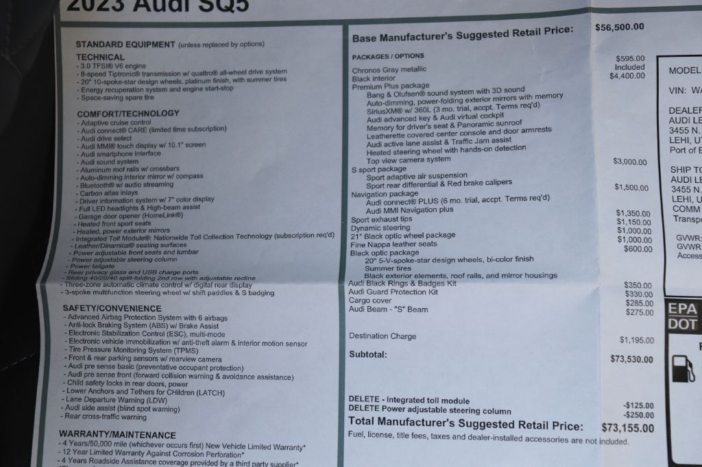 ONE Owner! ABSOLUTELY Gorgeous Car Dressed in one of the BEST Color Combo; 'Chronos Gray Metallic' Exterior on 'Black Leather' Interior! SUPER Clean- check out ALL 96 Pictures! Recently serviced and thoroughly inspected- Not a single problem. BRAND NEW 21 inch Wheels and Tires- All Four Corners. Clean Title & Carfax- no accident. HARD Loaded and Highly Optioned- Original MSRP $73,155. OPTIONS; Premium Plus Package, S Sport Package, Navigation Package, Black Optic Package, Sport Exhaust Tips, Dynamic Steering, Audi Black Rings and Badges, Audi S Beam, Heated Seats, Heated Steering Wheel, Reverse/ Back Up Camera with Top View, Panoramic Sun/moon roof, Power Lift-gate, Blind Spot Monitor, Parking Sensors, Sport Adaptive Air Suspension, Sport Rear Differential, Red Brake Calipers, Carbon Atlas Inlays etc. Non-smoker car. No Pets. State Emission Completed. Comes with Original Owners Manuals, Original MSRP Window Sticker, Two Sets of Keys & Qualifies for Extended Warranty up to an additional 60 Months/ 100k Miles.