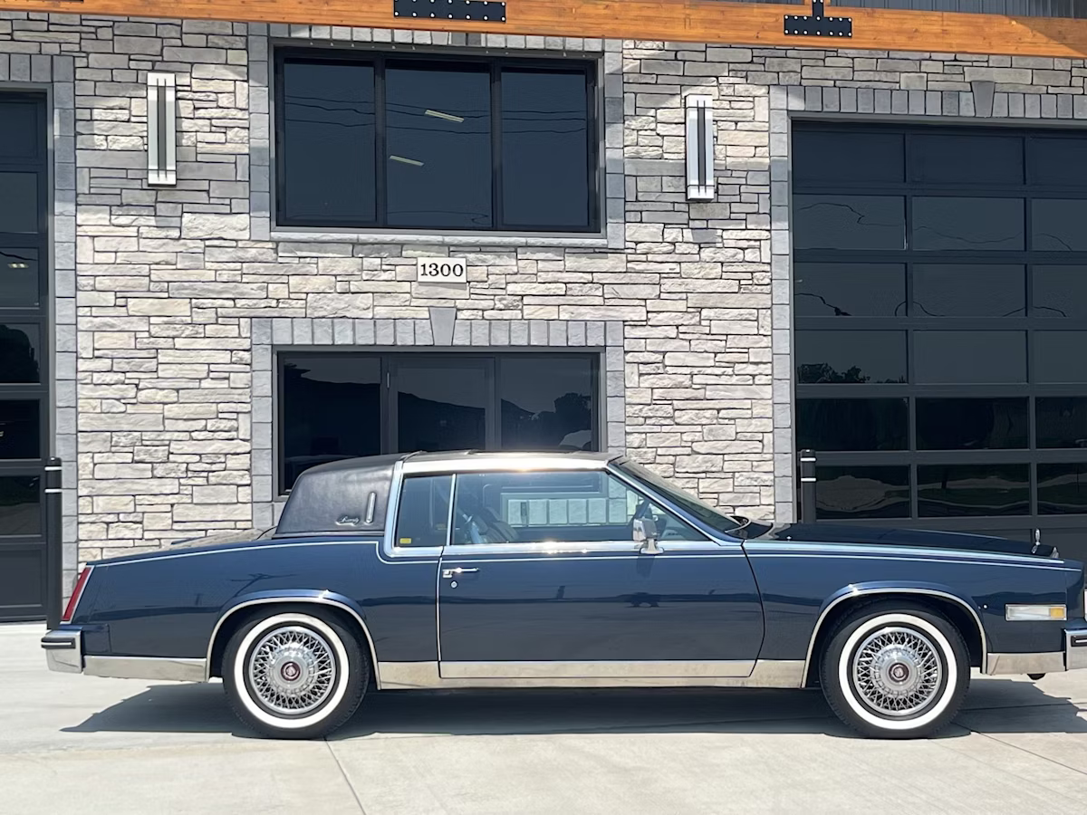 The original owner of this meticulously maintained 1984 Eldorado chose the aforementioned Biarritz trim, which added upscale features like a brushed stainless-steel roof over the front passenger compartment — a nod to the 1957-58 Eldorado Brougham — as well as a heavily padded landau vinyl top with opera lights on the rear roof section, chrome accents, wire wheel covers, pillowed and tufted leather seating, and a full suite of power features.