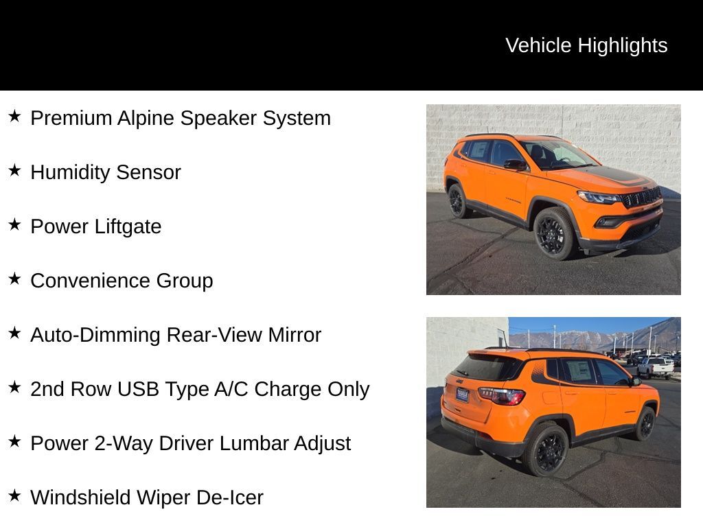 2026 Jeep Compass Latitude Joose 4D Sport Utility 2.0L I4 DOHC 4WD 4WD, 2nd Row USB Type A/C Charge Only, Auto-Dimming Rear-View Mirror, Convenience Group, Humidity Sensor, Power 2-Way Driver Lumbar Adjust, Power Liftgate, Premium Alpine Speaker System, Windshield Wiper De-Icer, 17'' x 7'' Aluminum Wheels, 3.73 Final Drive Ratio, 4-Wheel Disc Brakes, 6 Speakers, ABS brakes, Air Conditioning, Auto High-beam Headlights, Automatic temperature control, Brake assist, Compass, Delay-off headlights, Driver door bin, Driver vanity mirror, Dual front impact airbags, Dual front side impact airbags, Electronic Stability Control, Emergency communication system: SiriusXM Guardian, Four wheel independent suspension, Front anti-roll bar, Front Bucket Seats, Front fog lights, Front reading lights, Fully automatic headlights, Heated door mirrors, Heated front seats, Heated steering wheel, Illuminated entry, Knee airbag, Leather Shift Knob, Leather steering wheel, Low tire pressure warning, Occupant sensing airbag, Outside temperature display, Overhead airbag, Overhead console, Panic alarm, ParkView Rear Back-Up Camera, Passenger door bin, Passenger vanity mirror, Power door mirrors, Power steering, Power windows, Premium audio system: UConnect 5, Premium Cloth/Vinyl Bucket Seats, Rear anti-roll bar, Rear window defroster, Rear window wiper, Remote keyless entry, Security system, Speed control, Split folding rear seat, Spoiler, Steering wheel mounted audio controls, Tachometer, Telescoping steering wheel, Tilt steering wheel, Traction control, Variably intermittent wipers, Wheels: 18'' x 7'' Gloss Black Painted Aluminum, 4WD, 2nd Row USB Type A/C Charge Only, Auto-Dimming Rear-View Mirror, Convenience Group, Humidity Sensor, Power 2-Way Driver Lumbar Adjust, Power Liftgate, Premium Alpine Speaker System, Windshield Wiper De-Icer. 23/31 City/Highway MPG Price includes: $1000 - 2026 National Retail Bonus Cash . Exp. 03/02/2026 $1000 - 2026 West BC Retail Bonus Cash . Exp. 03/02/2026 $1960 - 2026 National Select Inventory Bonus Cash w/ 4TR . Exp. 01/04/2027 $2000 - 2026 National Select Inventory Bonus Cash. Exp. 03/02/2026