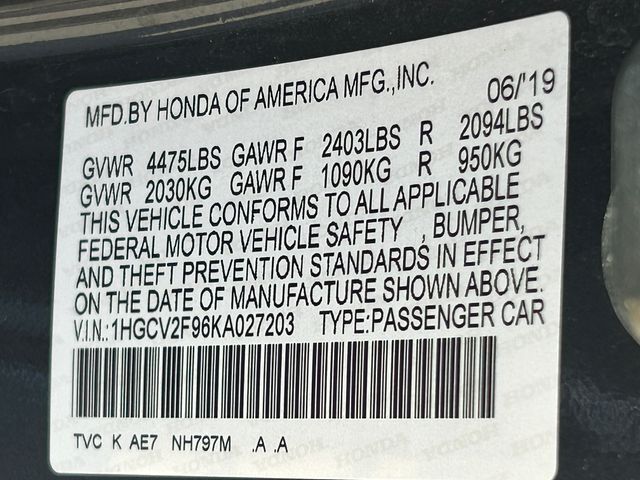 Gray 2019 Honda Accord Touring 2.0T FWD 10-Speed Automatic I4 DOHC 16V Turbocharged Black Leather.