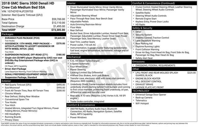 Turn every drive into something special with this GMC Sierra 3500HD from Salt Lake Valley Chevrolet! Designed for comfort, performance, and style, this vehicle comes fully equipped with modern technology and convenience features you’ll love. Plus, enjoy a $1,000 finance savings, already included in the sale price, when you finance through one of our trusted lending partners. If you’re shopping for used cars in Salt Lake City, or searching for the perfect SUV, truck, or sedan, this GMC Sierra 3500HD delivers the dependability and value you’re looking for. It’s the ideal match for your lifestyle - ready for everything from mountain adventures to city commutes. Visit Salt Lake Valley Chevrolet today and see why so many Utah drivers trust us for great deals on quality pre-owned vehicles. Explore our inventory online at www.slvchevy.com or call 801-969-8221 to schedule your test drive today! This impressive vehicle includes Driver Alert Package (Forward Collision Alert and Lane Departure Warning System), Duramax Plus Package (Chrome Recovery Hooks), Gooseneck/5th Wheel Prep Package, Off-Road Suspension Package (Hill Descent Control), Preferred Equipment Group 5SA (110-Volt AC Power Outlet, 150 Amps Alternator, 8'' Multi-Color Customizable Driver Display, Auto-Dimming Inside Rear-View Mirror, Chrome Bodyside Moldings, Chrome Door Handles, Chrome Power-Adjustable Heated Outside Mirrors, Color-Keyed Carpeted 1st & 2nd Row Floor Mats, Color-Keyed Carpeting Floor Covering, Deep-Tinted Glass, Driver & Front Passenger Visors, Dual-Zone Automatic Climate Control, Electric Rear-Window Defogger, Electronic Shift Transfer Case, EZ-Lift & Lower Tailgate, Front Body-Color Bumper, Front Frame-Mounted Black Recovery Hooks, Front Halogen Fog Lamps, GMC 4G LTE, GMC Connected Access, HD Radio, Heated & Ventilated Front Seating, Leather Wrapped Heated Steering Wheel, Manual Tilt-Wheel/Telescoping Steering Column, OnStar & GMC Connected Services Capable, Power Adjustable Pedals, Power Sliding Rear Window w/Defogger, Power Windows, Rear 60/40 Folding Bench Seat (Folds Up), Rear Body-Color Bumper w/Bumper CornerSteps, Rear Vision Camera, Rear Wheelhouse Liners, Remote Keyless Entry, Remote Locking Tailgate, Remote Vehicle Starter System, Single-Slot CD/MP3 Player, Steering Wheel Audio Controls, Ultrasonic Front & Rear Park Assist, Unauthorized Entry Theft-Deterrent System, and Universal Home Remote), Standard Suspension Package, Trailering Equipment, 18'' Chromed Aluminum Wheels, 4-Wheel Disc Brakes, 7 Speakers, ABS brakes, Adjustable pedals, Air Conditioning, Alloy wheels, AM/FM radio: SiriusXM, Apple CarPlay/Android Auto, Auto-dimming Rear-View mirror, Automatic temperature control, Black Front & Rear Molded Splash Guards (LPO), Bodyside moldings, Bose Speaker System, Brake assist, Bumpers: body-color, CD player, Chrome wheels, Compass, Delay-off headlights, Driver door bin, Driver vanity mirror, Dual front impact airbags, Dual front side impact airbags, Electronic Stability Control, Emergency communication system: OnStar Guidance, Engine Block Heater, Exhaust Brake, Exterior Parking Camera Rear, Floor Mounted Console, Front anti-roll bar, Front Bucket Seats, Front Center Armrest, Front dual zone A/C, Front fog lights, Front Full Feature Bucket Seats, Front License Plate Kit, Front reading lights, Front wheel independent suspension, Fully automatic headlights, Garage door transmitter, Heated door mirrors, Heated Driver & Front Passenger Seats, Heated front seats, Heated steering wheel, High-Intensity Discharge Headlights, Illuminated entry, Memory seat, Navigation System, Occupant sensing airbag, Outside temperature display, Overhead airbag, Overhead console, Panic alarm, Passenger door bin, Passenger vanity mirror, Pedal memory, Perforated Leather-Appointed Seat Trim, Power door mirrors, Power driver seat, Power passenger seat, Power steering, Power Sunroof, Power windows, Premium audio system: GMC Infotainment System, Radio: AM/FM/SiriusXM w