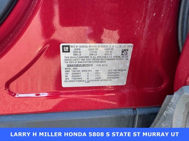 AWD.Priced below KBB Fair Purchase Price!Odometer is 16177 miles below market average!Larry H. Miller Honda Murray offers this 2018 Cajun Red Tintcoat Chevrolet Equinox LT AWD It is loaded with many standard and optional features including: Confidence & Convenience Package, Driver Confidence Package (Lane Change Alert w/Side Blind Zone Alert, Outside Heated Power-Adjustable Mirrors, Rear Cross Traffic Alert, and Rear Park Assist w/Audible Warning), Driver Convenience Package (3-Spoke Leather-Wrapped Steering Wheel, Dual Zone Automatic Climate Control, Heated Driver & Front Passenger Seats, Remote Vehicle Starter System, and Universal Home Remote), Floor Liner Package (LPO) (All-Weather Floor Liners (LPO) and Integrated Cargo Liner (LPO)), Infotainment Package (120-Volt Power Outlet, 2 Rear USB Charging-Only Ports, 2 USB Data Ports, 2 USB Ports & Auxiliary Input Jack, 6 Speaker Audio System Feature, Bluetooth® For Phone, Enhanced Multi-Color Driver Instrument Info, Radio: 8 Chevrolet MyLink AM/FM Stereo, and SiriusXM Satellite Radio), Preferred Equipment Group 3LT (Diesel B20 Fuel, Diesel Particle Filter, Electric Auxiliary Cabin Heater, and Selective Catalytic Reduction System Exhaust), Sun & Infotainment Package (Power Sunroof and Rear Power Liftgate), AWD, 17 Aluminum Wheels, 2.89 Final Drive Axle Ratio, 4-Wheel Disc Brakes, 6 Speakers, 8-Way Power Driver Seat Adjuster, ABS brakes, Air Conditioning, Alloy wheels, AM/FM radio: SiriusXM, Apple CarPlay/Android Auto, Automatic temperature control, Brake assist, Bumpers: body-color, Compass, Delay-off headlights, Driver door bin, Driver vanity mirror, Dual front impact airbags, Dual front side impact airbags, Electronic Stability Control, Emergency communication system: OnStar and Chevrolet connected services capable, Exterior Parking Camera Rear, Four wheel independent suspension, Front anti-roll bar, Front Bucket Seats, Front Center Armrest, Front dual zone A/C, Front Passenger 4-Way Manual Seat Adjuster, Front reading lights, Fully automatic headlights, Garage door transmitter, Heated door mirrors, Heated front seats, High-Intensity Discharge Headlights, Illuminated entry, Leather Shift Knob, Low tire pressure warning, Occupant sensing airbag, Outside temperature display, Overhead airbag, Overhead console, Panic alarm, Passenger door bin, Passenger vanity mirror, Power door mirrors, Power driver seat, Power steering, Power windows, Premium audio system: Chevrolet MyLink, Premium Cloth Seat Trim, Radio data system, Radio: Chevrolet MyLink AM/FM Stereo, Rear anti-roll bar, Rear reading lights, Rear seat center armrest, Rear window defroster, Rear window wiper, Remote keyless entry, Roof rack: rails only, Security system, Speed control, Speed-sensing steering, Split folding rear seat, Spoiler, Steering wheel mounted audio controls, Tachometer, Telescoping steering wheel, Tilt steering wheel, Traction control, Trip computer, Turn signal indicator mirrors, USB Port & Auxiliary Input Jack, and Variably intermittent wipers.Awards:* JD Power Automotive Performance, Execution and Layout (APEAL) Study * 2018 KBB.com Best Family Cars * 2018 KBB.com 10 Best SUVs Under $25,000 * 2018 KBB.com 10 Most Awarded Brands