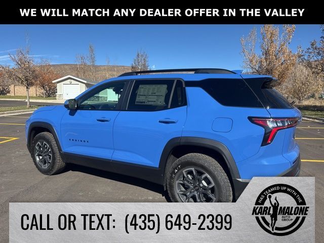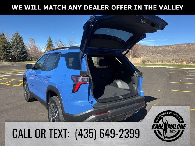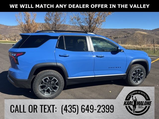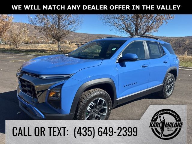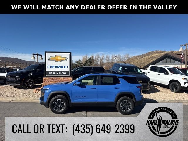 Reef Blue Metallic 2026 Chevrolet Equinox ACTIV AWD 8-Speed Automatic 1.5L DOHC AWD, 2-Way Power Driver Lumbar Control Seat Adjuster, 3.47 Final Drive Axle Ratio, 4-Wheel Disc Brakes, 6 Speakers, ABS brakes, Air Conditioning, Alloy wheels, AM/FM radio: SiriusXM, Auto High-beam Headlights, Automatic temperature control, Brake assist, Bumpers: body-color, Compass, Convenience Package III, Delay-off headlights, Driver 8-Way Power Seat Adjuster, Driver door bin, Driver vanity mirror, Dual front impact airbags, Dual front side impact airbags, Electronic Stability Control, Emergency communication system: OnStar and Chevrolet connected services capable, Four wheel independent suspension, Front anti-roll bar, Front Bucket Seats, Front Center Armrest, Front dual zone A/C, Front Passenger 2-Way Power Lumbar Seat Adjuster, Front Passenger 4-Way Manual Seat Adjuster, Front Passenger 8-Way Power Seat Adjuster, Front reading lights, Fully automatic headlights, Garage door transmitter, Heated door mirrors, Heated Driver and Front Passenger Seats, Heated front seats, Heated Rear Outboard Seating Positions, Heated steering wheel, Illuminated entry, Low tire pressure warning, Memory Settings, Navigation System, Occupant sensing airbag, Outside temperature display, Overhead airbag, Overhead console, Panic alarm, Passenger door bin, Passenger vanity mirror, Power door mirrors, Power driver seat, Power Dual Glass Panoramic Sliding Sunroof, Power Liftgate, Power steering, Power windows, Preferred Equipment Group KDZ, Premium audio system: Chevrolet Infotainment 3 Plus, Radio data system, Radio: 11.3'' Diagonal Advanced Color LCD Display, Rain sensing wipers, Rear anti-roll bar, Rear reading lights, Rear seat center armrest, Rear window defroster, Rear window wiper, Remote keyless entry, Security system, SiriusXM with 360L Trial Subscription, Speed control, Speed-sensing steering, Split folding rear seat, Spoiler, Steering wheel mounted audio controls, Sueded Microfiber Seat Trim, Tachometer, Telescoping steering wheel, Tilt steering wheel, Traction control, Trip computer, Variably intermittent wipers, Ventilated Driver Seat, Ventilated Front Passenger Seat, Wheels: 17'' Dark Android Painted Machined-Face, AWD.