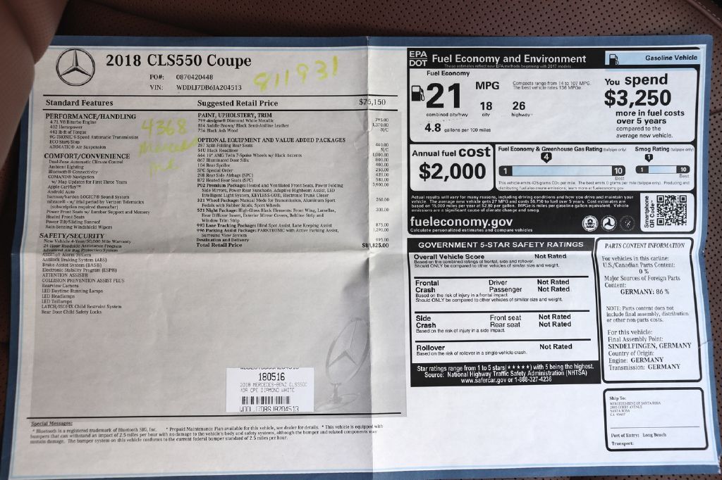 OPTIONS; Navigation, Rear View/ Back Up Camera with Top View Camera, Lane Departure, Blind Spot Monitor, Parking Assistance, Sun/ Moon Roof, Harmon/Kardon Premium Sound, Heated & Ventilated/Cooled Seats, Active Multicontour Driver Seat, Power Trunk Lift Gate, KEYLESS-Go, Rear Spoiler and more! Comes with Original Owner's Manuals, Original MSRP Window Sticker & Qualifies for Extended Warranty up to an additional 60 Months/ 100k Miles.