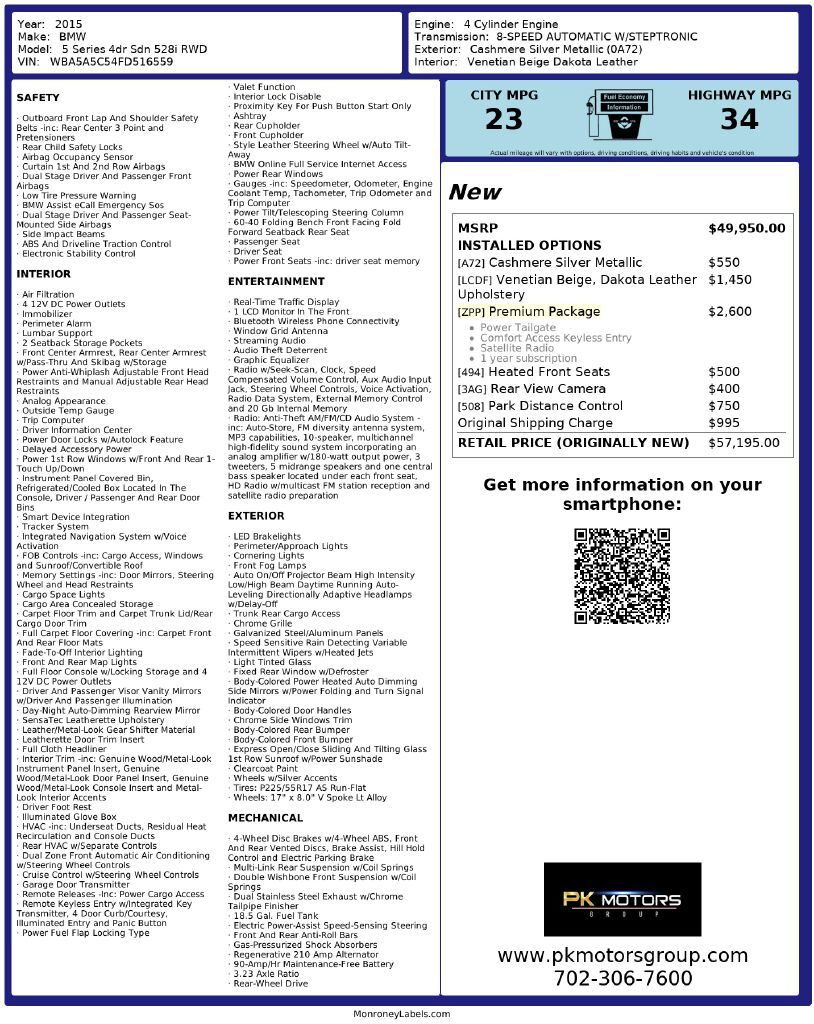 ABSOLUTELY Gorgeous Car! SUPER Clean- Check out ALL 89 pictures. Twin Power Turbo! Recently Serviced & Thoroughly inspected- not a single problem. No leaks. This BMW is the 528i with Premium Package. HARD Loaded & Highly Optioned- Original MSRP $57,195. Clean Title & Carfax- no accident. Comes in Gorgeous 'Cashmere Silver Metallic' Exterior on 'Venetian Beige' Leather interior. Non-smoker car. No pets. OPTIONS; Navigation, Reverse/ Back Up camera, Park Distance Control, Sun/moon roof, Comfort Access, Power Tailgate etc. Non-Smoker Car. No Pets. State Emission completed! Comes with Original Owners manuals, Original MRSP Window Sticker & Qualifies for Extended Warranty up to an additional 60 Months/ 100k Miles.