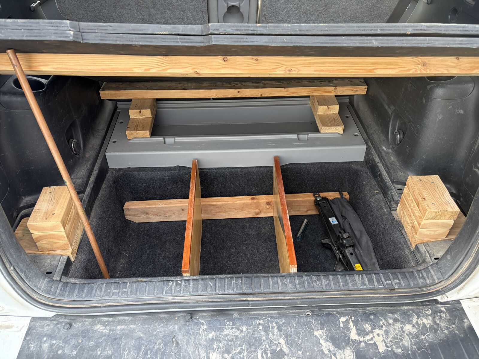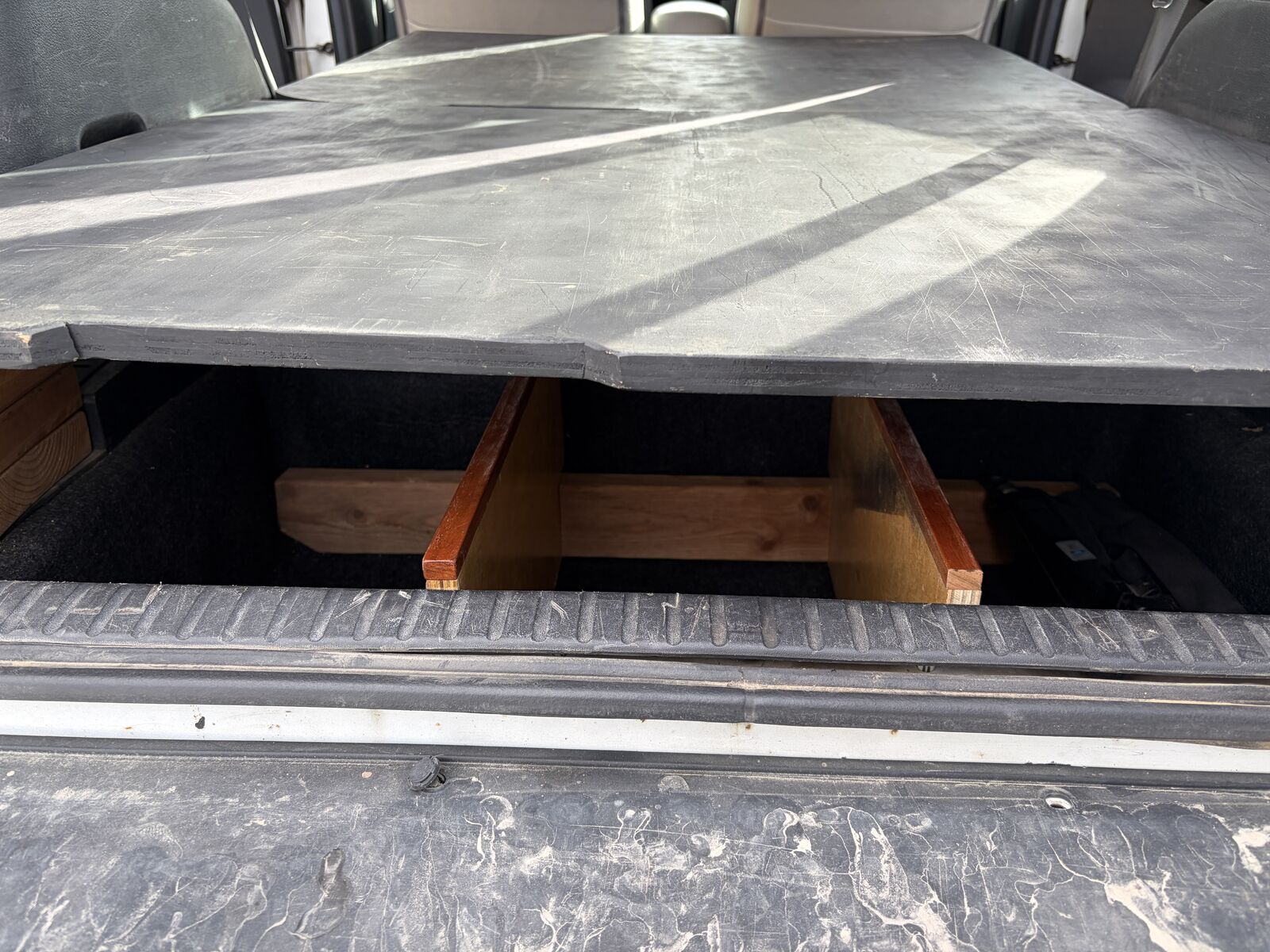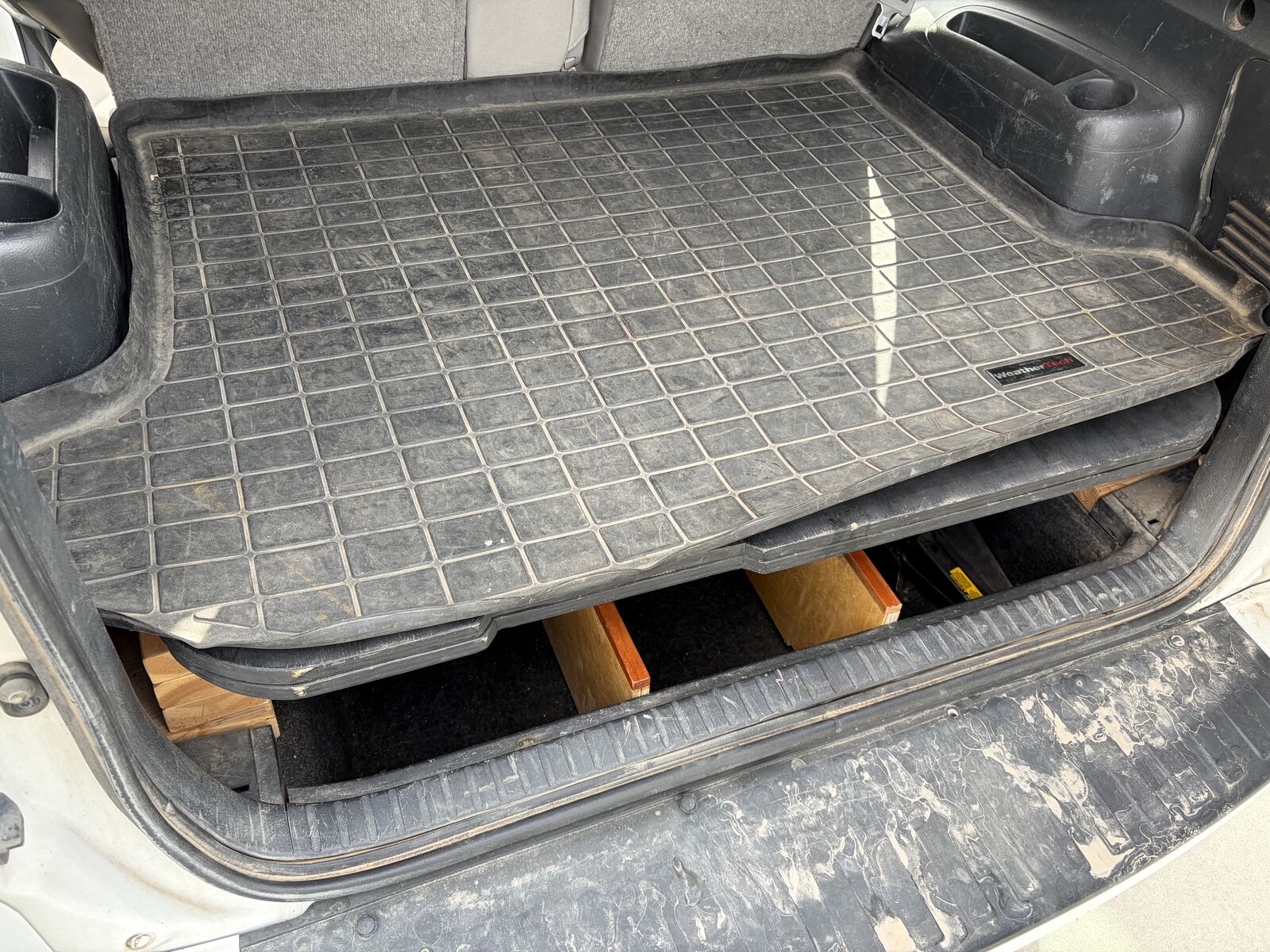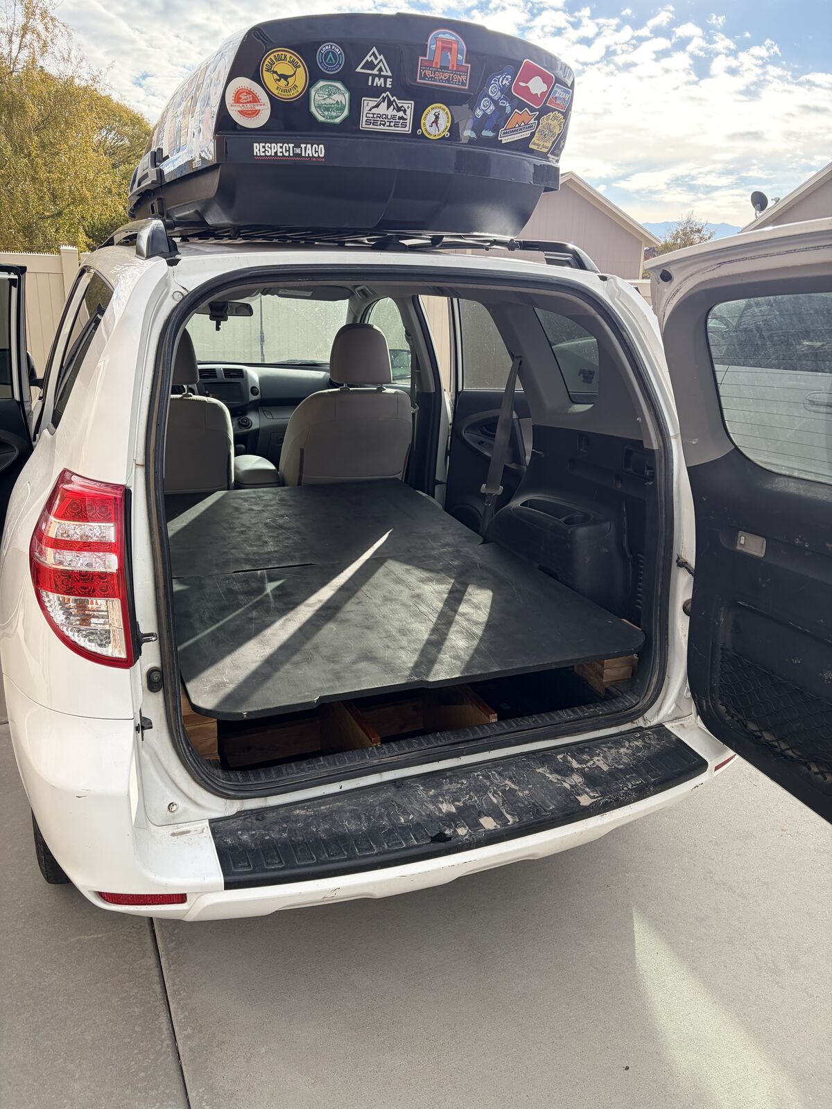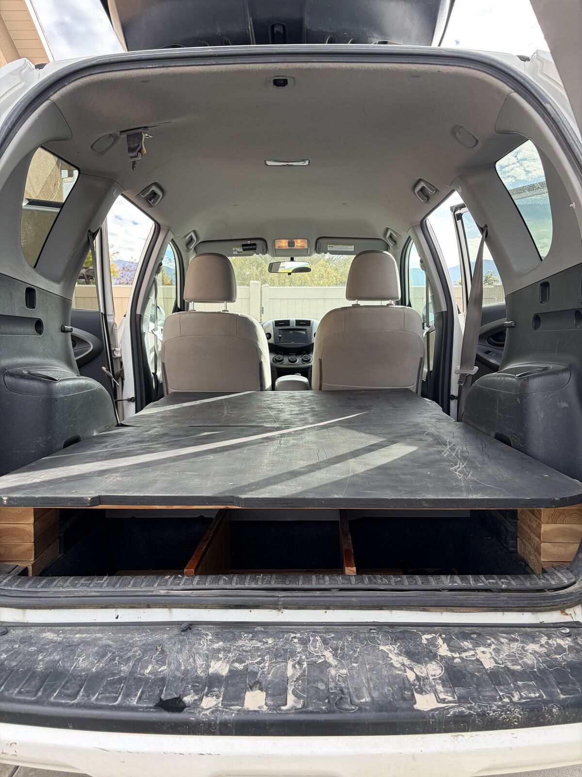 Upgrades: CarPlay-compatible stereo deck (lightning cable), backup camera, fog lights, WeatherTech floor mats, and custom trunk storage with an extendable flat platform (fits a full air mattress — I’m 6’1” and can sleep comfortably in the back).