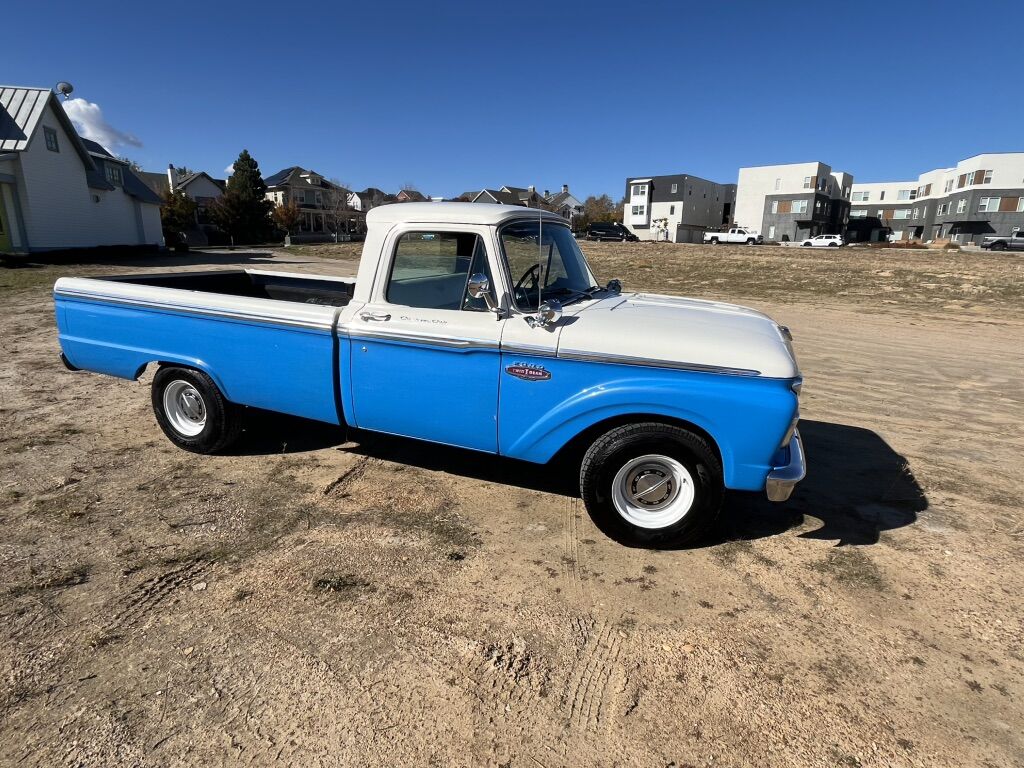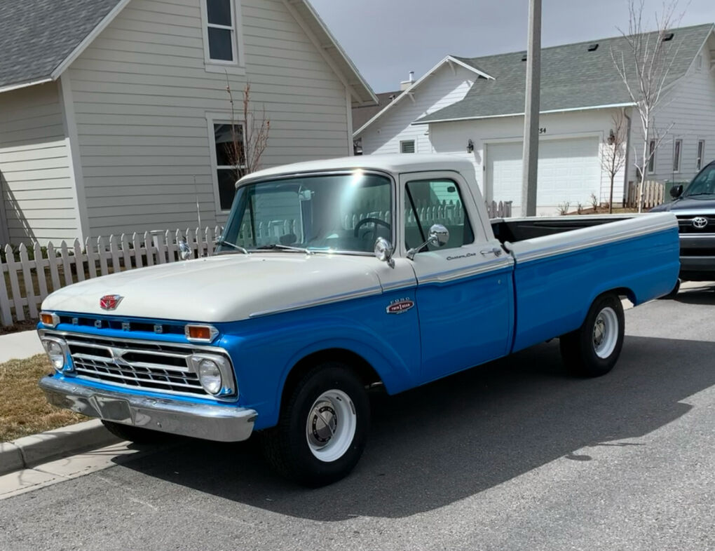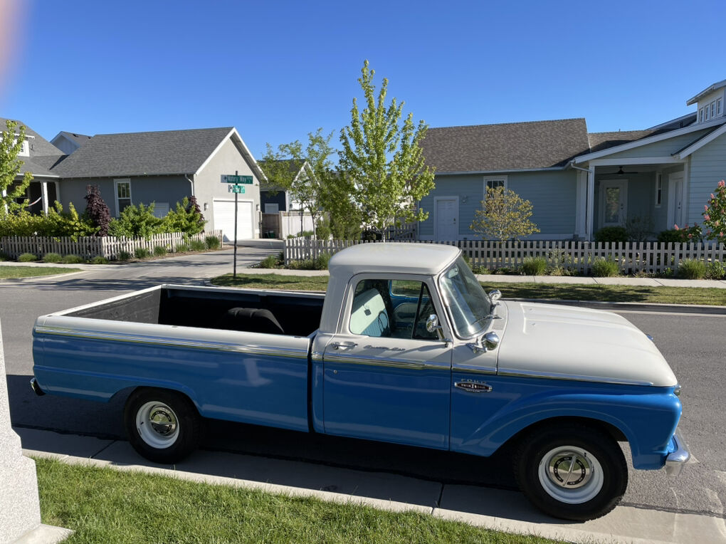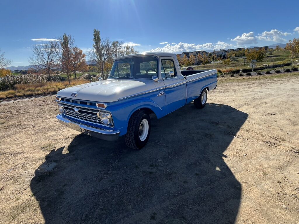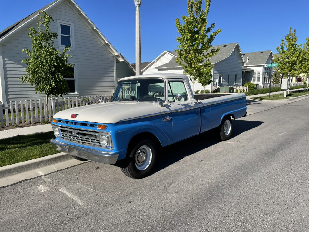 1966 F-100 custom cab finished in blue and white, with new interior. 352 V8 runs strong, no issues. Solid 4 speed transmission, new clutch, brakes are great, solid frame, newer tires on newer wheels, new plugs & wires. All gauges, lights, heater, wipers, work. New rear diff, drive shaft & axle-3.5 ratio. All around great truck, drive it anywhere.