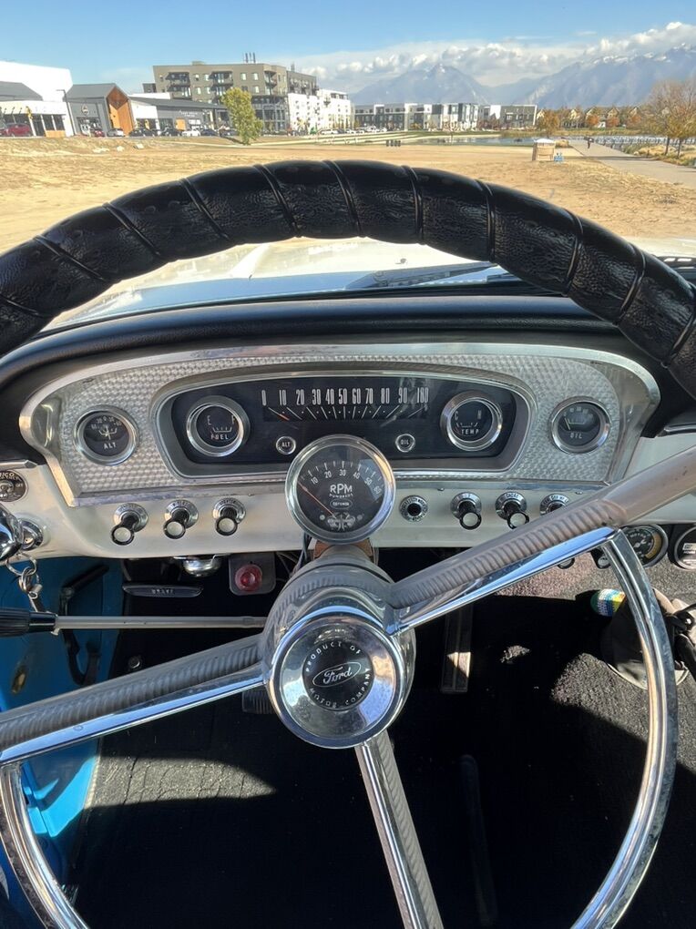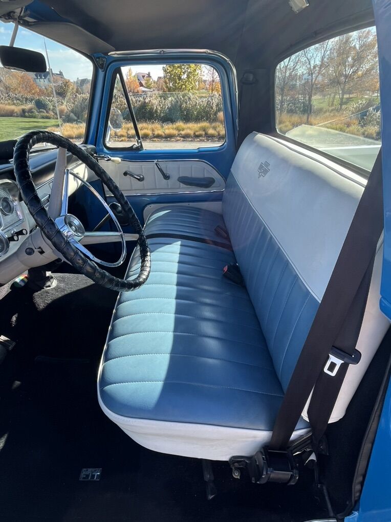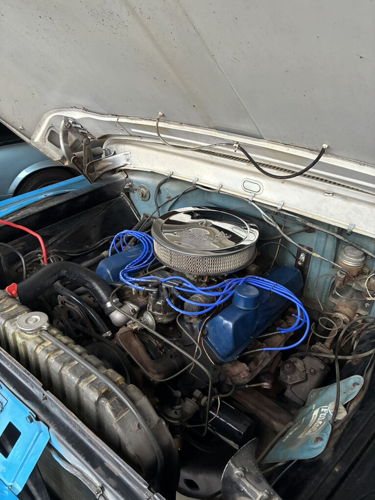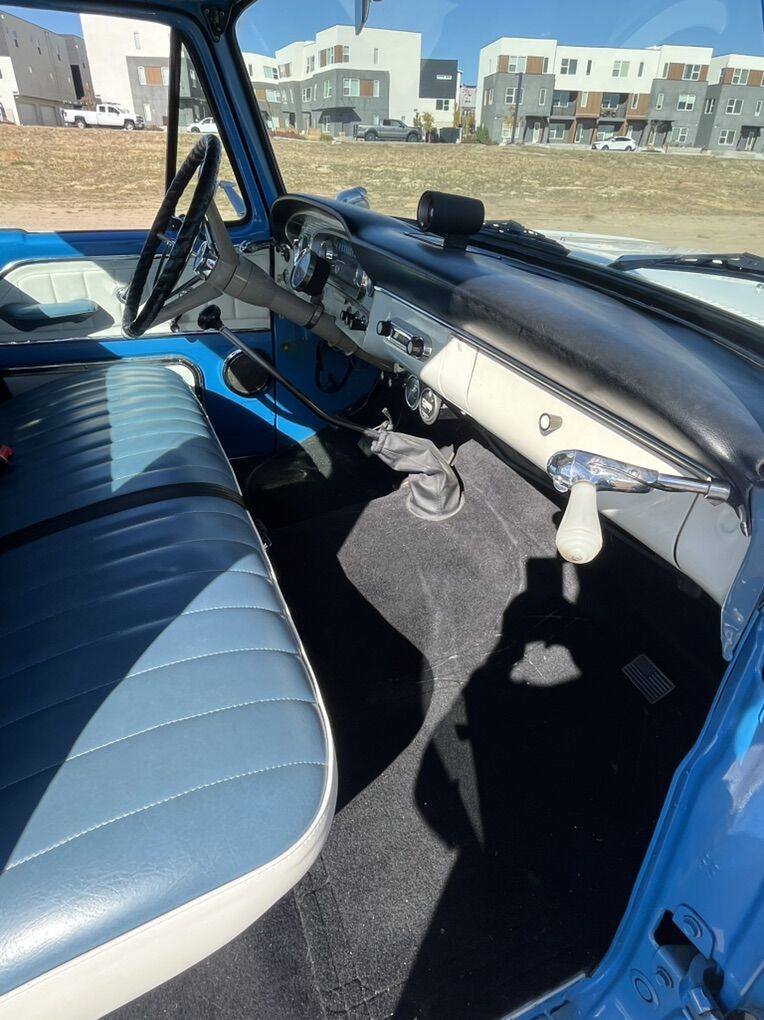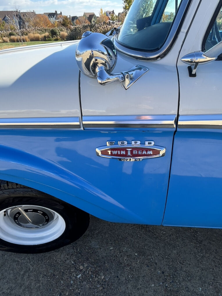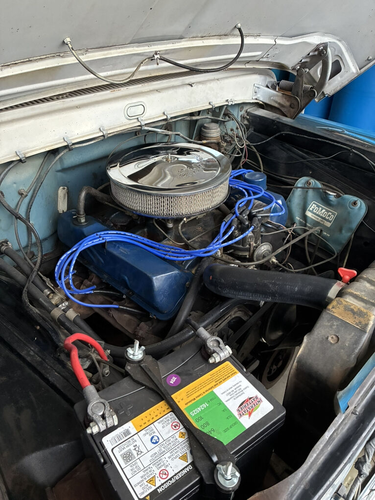 1966 F-100 custom cab finished in blue and white, with new interior. 352 V8 runs strong, no issues. Solid 4 speed transmission, new clutch, brakes are great, solid frame, newer tires on newer wheels, new plugs & wires. All gauges, lights, heater, wipers, work. New rear diff, drive shaft & axle-3.5 ratio. All around great truck, drive it anywhere.