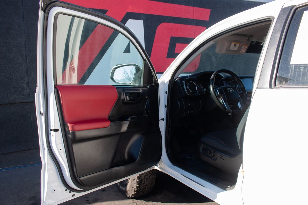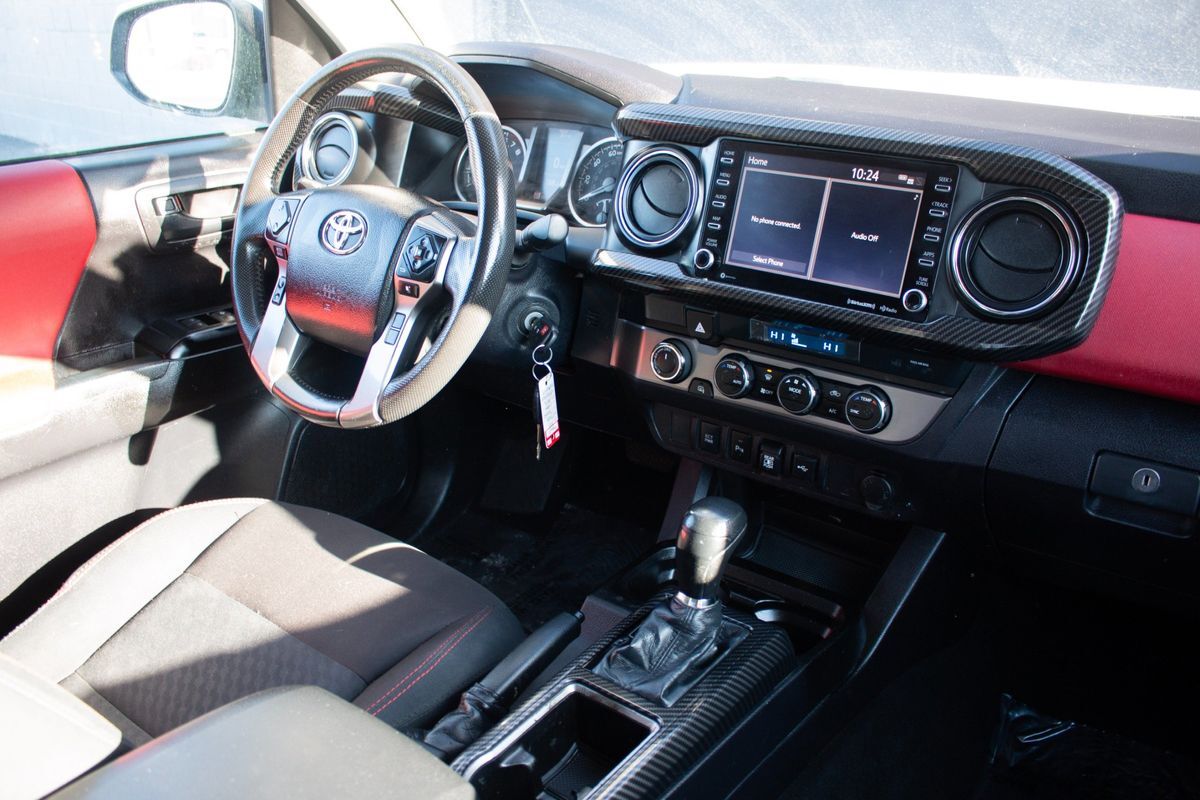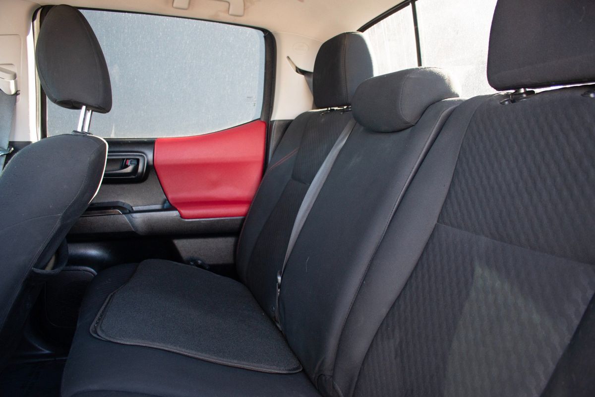 Inside- the Tacoma presents a sophisticated cabin with Black upholstery accentuated by Red Accent Stitching- creating a sporty yet elegant interior ambiance. The SR5 package enhances the experience with intuitive controls and modern conveniences- while the SR5 parking sonar & navigation package ensures you stay on track with ease and precision. For those who face unpredictable weather conditions- the all-weather floor liners offer protection and durability- capable of withstanding mud- snow- and rain.