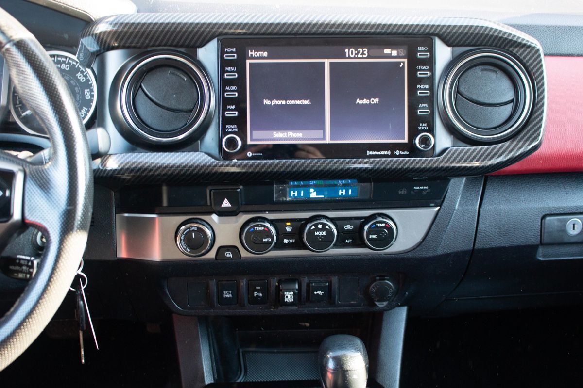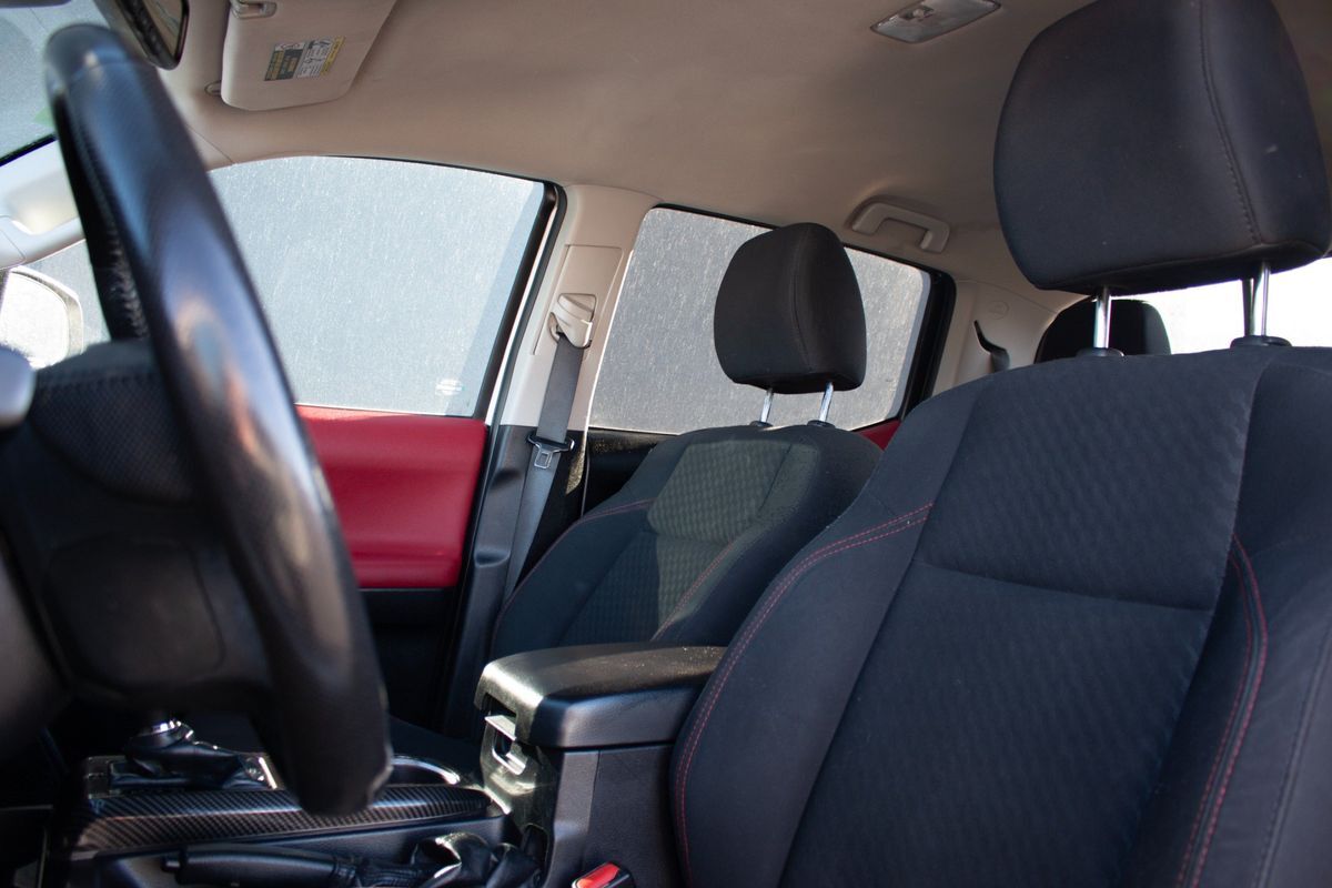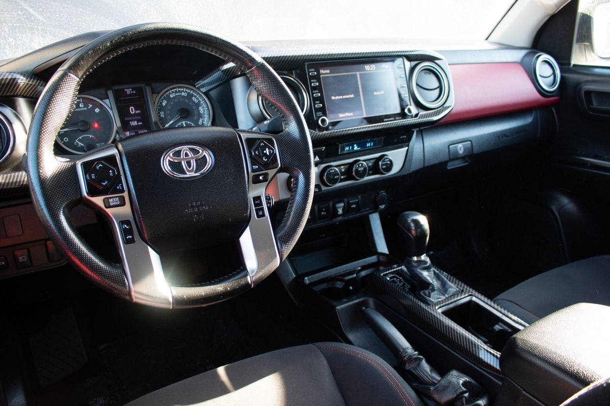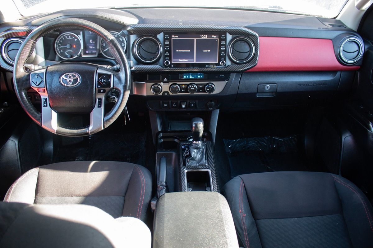 Inside- the Tacoma presents a sophisticated cabin with Black upholstery accentuated by Red Accent Stitching- creating a sporty yet elegant interior ambiance. The SR5 package enhances the experience with intuitive controls and modern conveniences- while the SR5 parking sonar & navigation package ensures you stay on track with ease and precision. For those who face unpredictable weather conditions- the all-weather floor liners offer protection and durability- capable of withstanding mud- snow- and rain.
