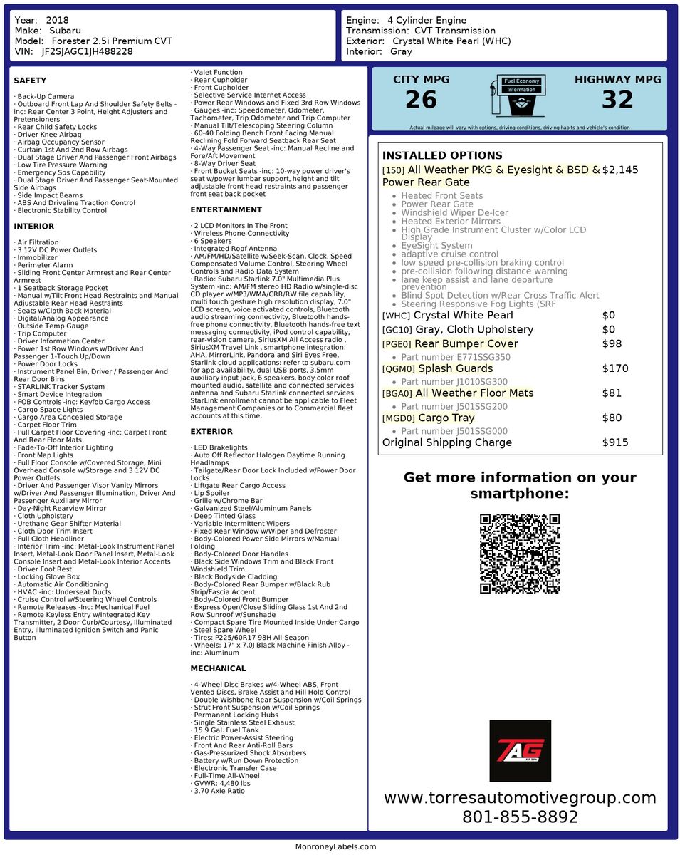 Convenience is also a hallmark of this model- showcased by the power rear gate for effortless access to the cargo area. The inclusion of all-weather floor mats and a cargo tray helps protect the interior from the elements and daily wear- making clean-up a breeze. The 2018 Subaru Forester 2.5i Premium CVT beautifully marries practicality and modern technology- ensuring every drive is an enjoyable and secure experience.