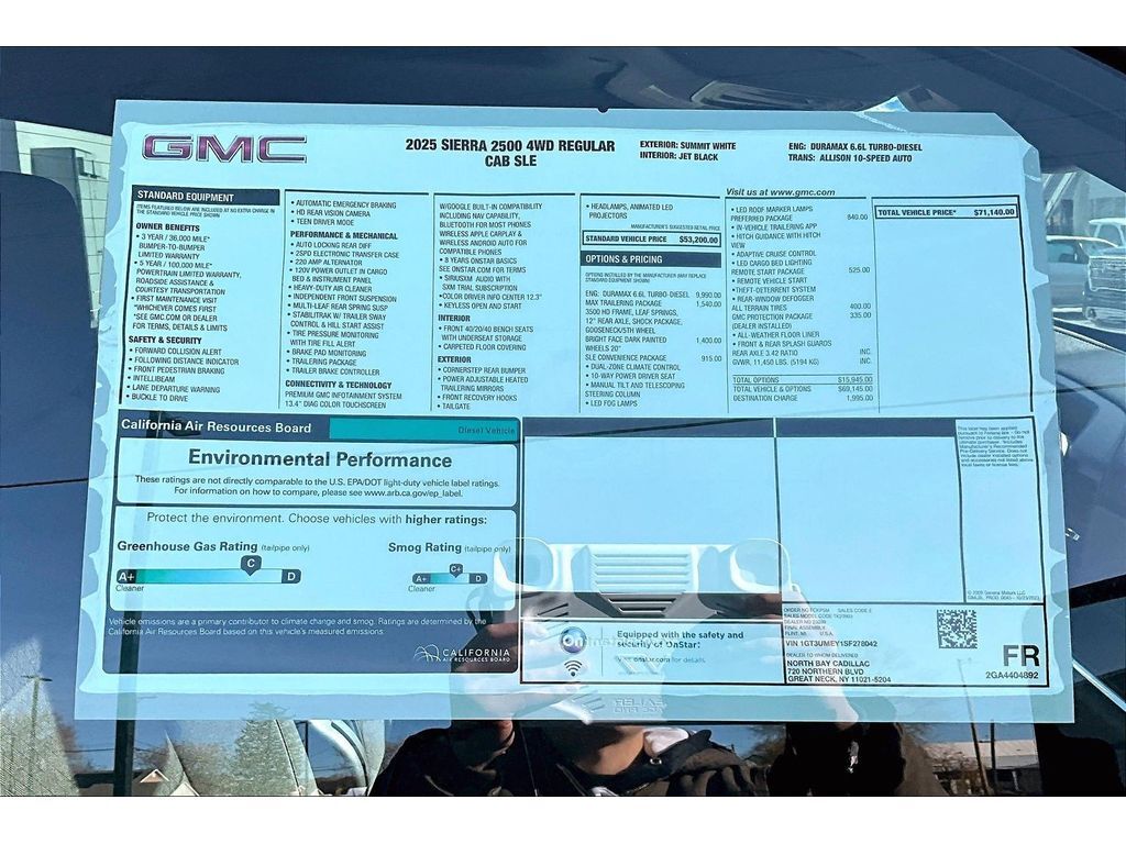 Equipment This unit's Lane Departure Warning keeps you safe by alerting you when you drift from your lane. See what's behind you with the back up camera on the GMC Sierra. Never get into a cold vehicle again with the remote start feature on this GMC Sierra. The steering wheel audio controls on this 3/4 ton pickup keep the volume and station within easy reach. The GMC Sierra has auto-adjust speed for safe following. This GMC Sierra keeps you comfortable with Auto Climate. It offers Android Auto for seamless smartphone integration. Apple CarPlay: Seamless smartphone integration for this vehicle - stay connected and entertained on the go! Bluetooth technology is built into the vehicle, keeping your hands on the steering wheel and your focus on the road. with XM/Sirus Satellite Radio you are no longer restricted by poor quality local radio stations while driving this 3/4 ton pickup. Anywhere on the planet, you will have hundreds of digital stations to choose from. Packages SLE Convenience Package: Manual Tilt-Wheel/telescoping Steering Column 10-Way Power Driver Seat Adjuster with Lumbar LED Fog Lamps LED Smoked Amber Roof Marker Lamps A/C with Dual-Zone Automatic Climate Control. Max Trailering Package: 11. 450 lbs (5. 194 Kg) GVWR Gooseneck/5th Wheel Prep Package. Preferred Package: LED Cargo Area Lighting In-Vehicle Trailering System App Adaptive Cruise Control Hitch Guidance with Hitch View. Preferred Equipment Group 3SA: OnStar Services Capable 120-Volt Bed Mounted Power Outlet 4-Way Manual Driver Seat Adjuster 2-Speed Electronic Shift Transfer Case SiriusXM with 360L Trial Subscription Deep-Tinted Glass Chrome Surround Grille with Chrome Insert Bars Sierra HD Pro Safety Keyless Open and Start Wireless Phone Projection 120-Volt Instrument Panel Power Outlet Push Button Start 2 Charge/data USB Ports Steering Wheel Audio Controls. Remote Start Package: Remote Vehicle Starter System Electric Rear-Window Defogger Unauthorized Entry Theft-Deterrent System. GMC Protection Package: Black Front and Rear Molded Splash Guards All-Weather Floor Liners. 20' Bright Face Wheels with Dark Painted Pockets. Gooseneck/5th Wheel Prep Package. Spray-On Pickup Bedliner with GMC Logo. LT275/65R20 AT BW Tires. Electric Rear-Window Defogger. Black Front and Rear Molded Splash Guards. All-Weather Floor Liners. LED Cargo Area Lighting. Equipment listed is based on original vehicle build and subject to change. Please confirm the accuracy of the included equipment by calling the dealer prior to purchase.