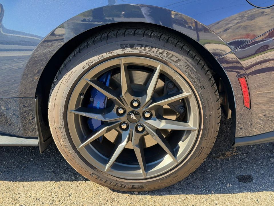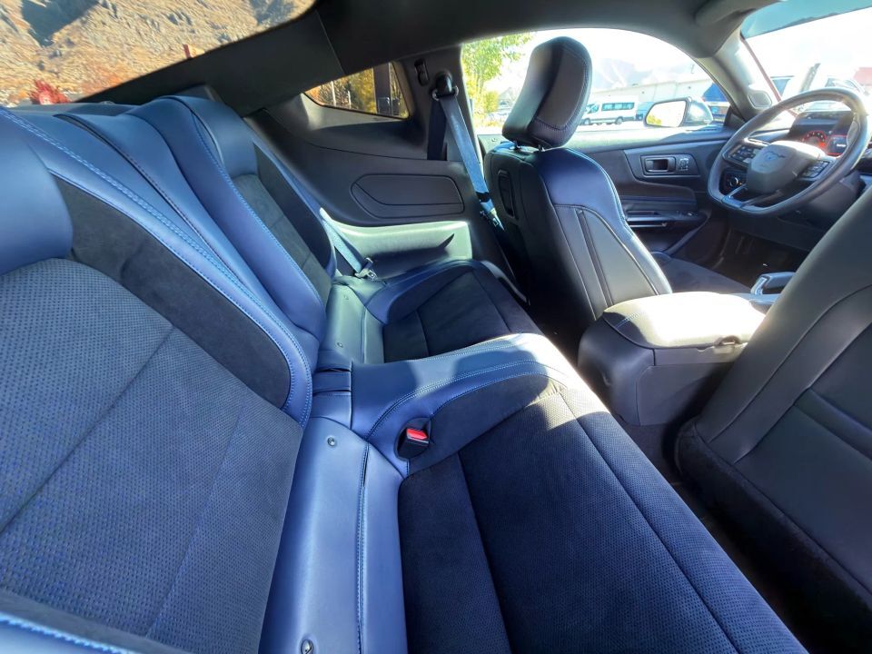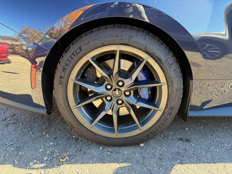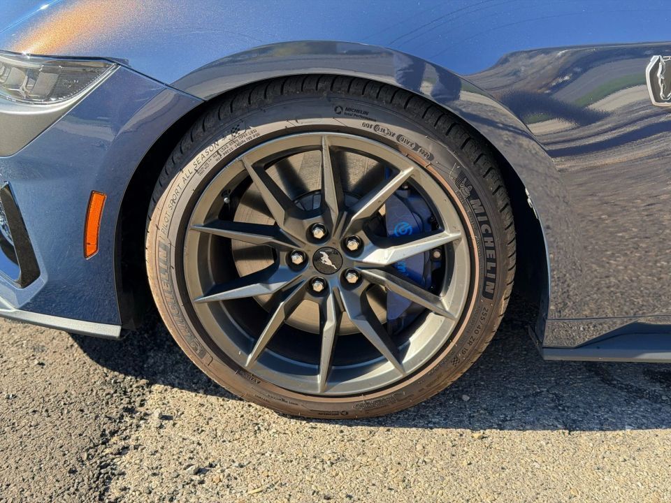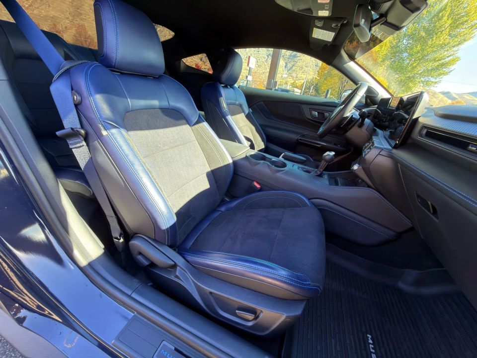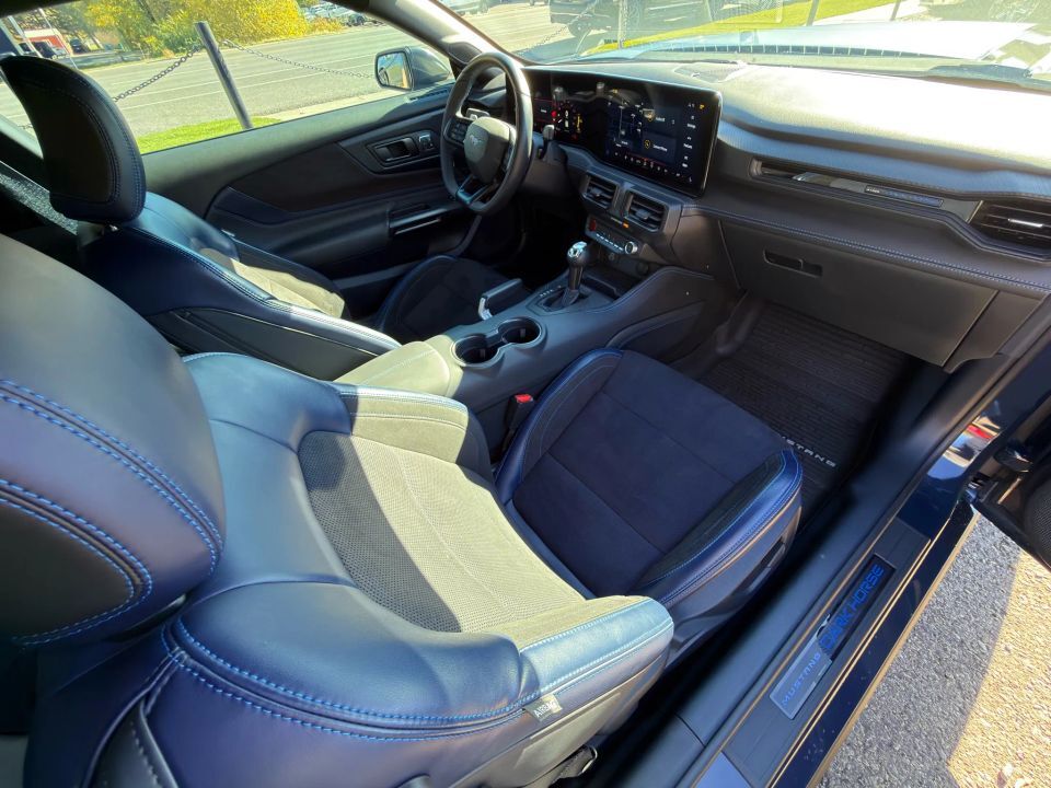 The exterior embodies Ford�s aggressive design language, featuring the Dark Horse Appearance Package with Tarnished Dark Paint, Gloss Black badging, unique hood and decklid graphics, and Blue Brembo brake calipers. Its bold stance on 19-inch aluminum wheels and aerodynamic sculpting give it a dominating road presence.