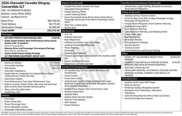 Discover the new Chevrolet Corvette at Salt Lake Valley Chevrolet in Salt Lake City! With bold design, modern technology, and reliable performance, Chevrolet makes every drive exciting. Whether it’s city streets or canyon roads, the Corvette is ready for anything. Call us today at 801-969-8221 to schedule a time to see it! --- 2026 Chevrolet Corvette Arctic White 6.2L V8 Automatic Leveling System Headlamp Control, Front Lift Adjustable Height with Memory, Heads-Up Display. --- Final price excludes tax, tag, title, documentation fees, dealer-installed options, and any market-based pricing adjustments. Financing through GM Financial is required for all discounts to apply. Special finance offers may not be combined with certain factory incentives. While we strive for accuracy, errors may occur—please verify all information with a sales representative. For the most accurate pricing, call (801) 969-8221 or visit us in person. Prices and payments are subject to change based on manufacturer incentives.