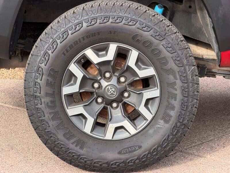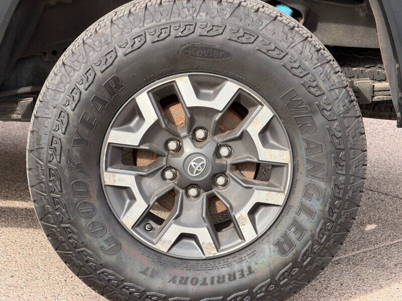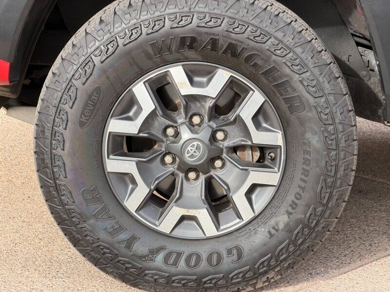 INSTALLED FEATURES: Air filtration, Front air conditioning, Front air conditioning zones: single, Airbag deactivation: occupant sensing passenger, Front airbags: dual, Knee airbags: dual front, Side airbags: front, Side curtain airbags: front / rear, Antenna type: diversity / mast, Auxiliary audio input: Bluetooth / iPod/iPhone / jack / USB, In-Dash CD: single disc, Internet radio app: iHeartRadio / Slacker, Radio: AM/FM / HD radio / touch screen display / voice operated, Radio data system, Satellite radio: SiriusXM, Speed sensitive volume control, Total speakers: 6, ABS: 4-wheel, Braking assist, Electronic brakeforce distribution, Front brake type: ventilated disc, Power brakes, Rear brake type: drum, Floor material: carpet, Shift knob trim: leather, Steering wheel trim: leather, Adaptive cruise control, Assist handle: front / rear, Center console: front console with armrest and storage, Cupholders: front / rear, Multi-function remote: panic alarm / proximity entry system, One-touch windows: 2, Overhead console: front, Power outlet(s): 115V cargo area / 12V front, Power steering: variable/speed-proportional, Power windows: lockout button, Push-button start, Reading lights: front / rear, Rearview mirror: auto-dimming, Steering wheel: tilt and telescopic, Steering wheel mounted controls: audio / cruise control / multi-function / phone / voice control, Storage: door pockets / front seatback / grocery bag holder / sunglasses holder / under rear seats, Sun visors, Wireless charging station: front, Bumper detail: rear step, Door handle color: body-color, Exhaust tip color: stainless steel, Fender lip moldings: black, Front bumper color: body-color, Grille color: chrome surround / metallic, Mirror color: body-color, Pickup bed light, Rear bumper color: chrome, Skid plate(s): front, Tailgate: removable, Window trim: black, Connected in-car apps: Yelp, Infotainment: Entune, Infotainment screen size: 7 in., Clock, Compass, Digital odometer, External temperature display, Fuel economy display: MPG / range, Gauge: tachometer, Instrument cluster screen size: 4.2 in., Multi-function display, Trip odometer, Warnings and reminders: coolant temperature warning / lamp failure / low fuel level / low oil pressure / maintenance due, Daytime running lights: LED, Front fog lights, Headlights: auto delay off / auto high beam dimmer / halogen, Side mirror adjustments: manual folding / power, Side mirrors: heated / integrated turn signals, 4WD selector: electronic hi-lo, 4WD type: part time, Alternator: 130 amps, Auxiliary oil cooler, Auxiliary transmission fluid cooler, Battery: maintenance-free, Battery saver, Drive mode selector, Locking differential: rear, Active head restraints: dual front, Automatic emergency braking: front / front pedestrian, Camera system: rearview, Child safety door locks, Child seat anchors: LATCH system, Impact sensor: fuel cut-off, Lane deviation sensors, Pre-collision warning system: audible warning / pedestrian detection / visual warning, Rearview monitor: in dash, Safety brake pedal system, Emergency locking retractors: front / rear, Front seatbelts: 3-point, Rear seatbelts: 3-point, Seatbelt force limiters: front, Seatbelt pretensioners: front, Seatbelt warning sensor: front, Driver seat manual adjustments: 4 / lumbar / reclining, Front headrests: 2 / adjustable, Front seat type: bucket, Passenger seat manual adjustments: 4 / reclining, Rear headrests: 3 / adjustable / foldable, Rear seat folding: split, Rear seat type: 60-40 split bench, Upholstery: cloth, Anti-theft system: vehicle immobilizer, Power door locks: anti-lockout / auto-locking, Hill holder control, Off-road driving assist: hill ascent, Stability control, Traction control, Trailer stability control, Front shock type: gas, Front spring type: coil, Front stabilizer bar: diameter 30 mm, Front struts, Front suspension classification: independent, Front suspension type: double wishbone, Rear shock type: gas, Rear spring type: leaf, Rear stabilizer bar, Rear suspension classification: solid live axle, Rear suspension type: multi-leaf, Tuned suspension: off-road, Electronic messaging assistance: voice operated / with read function, Hands-free phone call integration: voice operated, Navigation data: real time traffic, Navigation system: touch screen display / voice operated, Wireless data link: Bluetooth, Pickup bed cargo management: tie-down anchors, Trailer hitch: Class IV, Trailer wiring: 4-pin / 7-pin, Spare tire mount location: underbody, Spare tire size: full-size, Spare wheel type: steel, Tire Pressure Monitoring System, Wheels: aluminum alloy, Front wipers: variable intermittent, Pickup sliding rear window: power horizontal, Power windows: safety reverse, Rear privacy glass, All-Weather Floor Liners, Door Sill Protectors, 5-in. Oval Tube Steps - Black, Technology Package, TRD Off-Road Premium Package, Truck Exterior Package, TRD 16 in. Off-Road Beadlock-Style Alloy Wheels - Gray