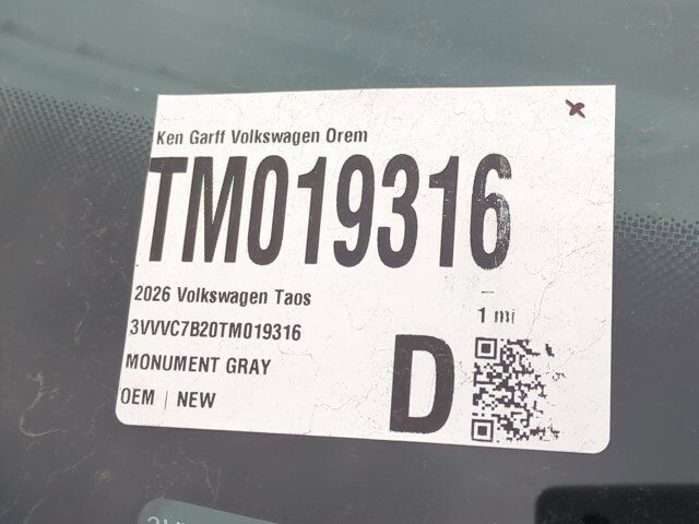 Monument Gray 2026 Volkswagen Taos 1.5T SE AWD 8-Speed Automatic with Tiptronic 1.5L I4 Turbocharged DOHC 16V LEV3-SULEV30 174hp Panoramic Sunroof Package, Retractable Privacy Cover for Cargo Area Blocks, Roadside Assistance Kit, Rubber Mats Kit, VW Care, 4-Wheel Disc Brakes, 6 Speakers, ABS brakes, Active Blind Spot Monitor, Air Conditioning, Alloy wheels, AM/FM radio: SiriusXM with 360L, Auto High-beam Headlights, Automatic temperature control, Brake assist, Bumpers: body-color, CloudTex & Cloth Seating Surfaces, Compass, Delay-off headlights, Driver door bin, Driver vanity mirror, Dual front impact airbags, Dual front side impact airbags, Electronic Stability Control, Emergency communication system: VW Car-Net Safe & Secure 5-year, Exterior Parking Camera Rear, First Aid Kit, Four wheel independent suspension, Front anti-roll bar, Front Bucket Seats, Front Center Armrest, Front dual zone A/C, Front reading lights, Front Strut Rear Multi-Link Suspension, Fully automatic headlights, Heated door mirrors, Heated Front Bucket Seats, Heated front seats, Heated steering wheel, Illuminated entry, Leather Shift Knob, Low tire pressure warning, Occupant sensing airbag, Outside temperature display, Overhead airbag, Overhead console, Panic alarm, Passenger door bin, Passenger vanity mirror, Power door mirrors, Power driver seat, Power steering, Power windows, Radio data system, Radio: MIB3 Composition Media AM/FM/HD, Rain sensing wipers, Rear anti-roll bar, Rear seat center armrest, Rear window defroster, Rear window wiper, Remote keyless entry, Security system, Speed control, Speed-sensing steering, Split folding rear seat, Spoiler, Steering wheel mounted audio controls, Tachometer, Telescoping steering wheel, Tilt steering wheel, Traction control, Trip computer, Variably intermittent wipers, Wheels: 18 2-Tone Machined Alloy, IQ.DRIVE, Panoramic Sunroof Package, Retractable Privacy Cover for Cargo Area Blocks, Roadside Assistance Kit, Rubber Mats Kit, VW Care.Recent Arrival! 25/33 City/Highway MPG $1,500 Financing Discount Included in all Discounts. Must allow Ken Garff VW to arrange financing. Must finance a minimum of 90% of MSRP. Not Valid with 0% or other subvented interest rates. Remaining Discounts are a Combination of Ken Garff Discounts and Remaining Manufacturer Rebates and Incentives. See dealer for complete details and limitations. $500 - Customer Bonus. Exp. 03/02/2026