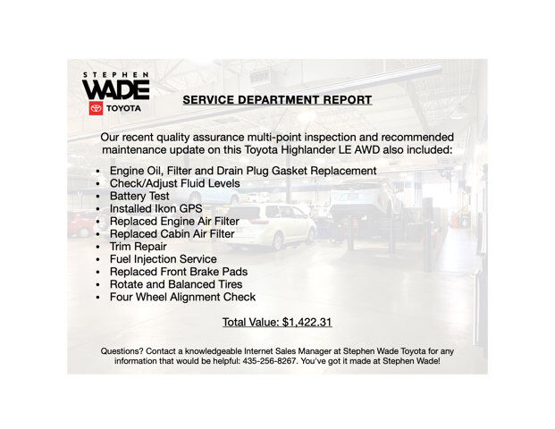 ONE OWNER CLEAN CARFAX. 2024 Toyota Highlander LE AWD in Midnight Black Metallic with Black Fabric. 2.4L 4-Cylinder Turbo Engine, 8-Speed Automatic Transmission, All-Wheel Drive w/Multi-Terrain Select.21/28 City/Highway MPG.CALL STEPHEN WADE TOYOTA: 435-241-3828.All-Weather Floor/Cargo Liner.SERVICE REPORT: At Stephen Wade Toyota, we do more to insure we offer the most mechanically sound pre-owned vehicles with maintenance that is up to date. Our recent quality assurance multi-point inspection and recommended maintenance update on this Highlander LE AWD also included an engine oil, filter and drain plug gasket replacement, check/adjust fluid levels, battery test, installed Ikon GPS, replaced engine air filter, replaced cabin air filter, trim repair, fuel injection service, replaced front brake pads, rotate and balanced tires and a four wheel alignment check - a $1,422.31 value.MARKET REPORT: We use advanced software to shop the automotive marketplace nationwide everyday. This allows us to competitively offer you the best value one can find anywhere. Contact our knowledgeable Internet sales managers; Danny, Jessica or Wesley at Stephen Wade Toyota for a priority test drive, or for any information that would be helpful: 435-241-3828. You've got it made at Stephen Wade!