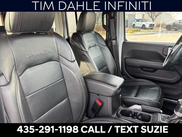 Inside, the Sahara trim includes comfort and tech touches like leather seats, an 8-speed automatic, Apple CarPlay / Android Auto, and advanced off-road underpinnings with reinforced suspension and skid protection.