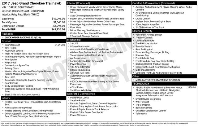 Turn every drive into something special with this Jeep Grand Cherokee from Salt Lake Valley Chevrolet! Designed for comfort, performance, and style, this vehicle comes fully equipped with modern technology and convenience features you’ll love. Price excludes tax, title, license fee, government fees, and $449 dealer documentary service fee. While every reasonable effort is made to ensure accuracy, we are not responsible for errors or omissions, and vehicles may be sold prior to inquiry—please contact the dealer to confirm availability. All financing is subject to approved credit. If you’re shopping for used cars in Salt Lake City, or searching for the perfect SUV, truck, or sedan, this Jeep Grand Cherokee delivers the dependability and value you’re looking for. It’s the ideal match for your lifestyle - ready for everything from mountain adventures to city commutes. Visit Salt Lake Valley Chevrolet today and see why so many Utah drivers trust us for great deals on quality pre-owned vehicles. Explore our inventory online at www.slvchevy.com or call 801-969-8221 to schedule your test drive today! This impressive vehicle includes Quick Order Package 23J, 1 Year Trial (Registration Required), 1-Year SiriusXM Radio Service, 10 Speakers, 3.45 Rear Axle Ratio, 4-Wheel Disc Brakes, 5-Year SiriusXM Traffic Service, 5-Year SiriusXM Travel Link Service, 8.4'' Touchscreen Display, ABS brakes, Air Conditioning, Alloy wheels, AM/FM radio: SiriusXM, Anti-whiplash front head restraints, Audio memory, Auto-dimming door mirrors, Auto-Dimming Rear-View Mirror, Auto-dimming Rear-View mirror, Auto-leveling suspension, Automatic temperature control, Brake assist, Bumpers: body-color, Compass, Delay-off headlights, Driver door bin, Driver vanity mirror, Dual front impact airbags, Dual front side impact airbags, Electronic Stability Control, Emergency communication system: Uconnect Access, Engine Oil Cooler, For Details Visit DriveUconnect.com, For More Info, Call 800-643-2112, Four wheel independent suspension, Front anti-roll bar, Front Bucket Seats, Front Center Armrest w/Storage, Front dual zone A/C, Front fog lights, Front reading lights, Fully automatic headlights, Garage door transmitter, GPS Antenna Input, GPS Navigation, HD Radio, Heated door mirrors, Heated front seats, Heated rear seats, Heated steering wheel, Illuminated entry, Instrument Cluster w/Off-Road Disp. Pages, Integrated Voice Command w/Bluetooth, Knee airbag, Leather Shift Knob, Low tire pressure warning, Manufacturer's Statement of Origin, Memory seat, Normal Duty Suspension - Increased Travel, Occupant sensing airbag, Outside temperature display, Overhead airbag, Overhead console, Panic alarm, ParkView Rear Back-Up Camera, Passenger door bin, Passenger vanity mirror, Power door mirrors, Power driver seat, Power Liftgate, Power passenger seat, Power steering, Power Sunroof, Power windows, Radio data system, Radio: Uconnect 3C Nav w/8.4'' Display, Radio: Uconnect 3C w/8.4'' Display, Rear anti-roll bar, Rear reading lights, Rear seat center armrest, Rear window defroster, Rear window wiper, Remote keyless entry, Roadside Assistance & 9-1-1 Call, Roof rack: rails only, Security system, SiriusXM Satellite Radio, SiriusXM Traffic, SiriusXM Travel Link, Speed control, Speed-Sensitive Wipers, Split folding rear seat, Spoiler, Steering wheel mounted audio controls, Tachometer, Telescoping steering wheel, Tilt steering wheel, Traction control, Trailhawk Leather/Suede Seats, Trip computer, Turn signal indicator mirrors, Uconnect Access, Variably intermittent wipers, Ventilated front seats, and Wheels: 18'' x 8.0'' Off Road Aluminum, offering everything you need for your next adventure.
