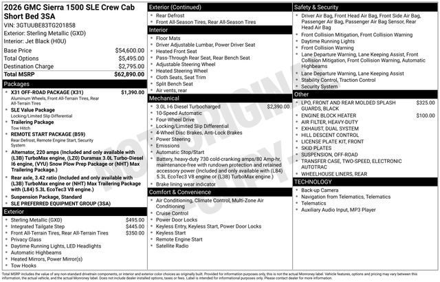 2026 GMC Sierra 1500 SLE 4D Crew Cab Sterling Metallic 3.0L I6 4WD 22/26 City/Highway MPG --- Please note that the final selling price does not include tax, tag, title, documentation fees, dealer-installed options, or pricing adjustments due to market demand. Financing through GM Financial is required for all discounts to be applied. Special finance offers may not be combined with some factory incentives. While we strive for accuracy, errors may occur, so please verify all information with a customer service representative. For the most accurate pricing, call us at (801) 265-1511 or visit our dealership in person. Prices and payments are subject to change based on manufacturer incentives. ... Sale Price may include dealer discount, $1750 - Buick & GMC Consumer Cash Program $2500 - GM Trade In Allowance Program $500 - Buick GMC Bonus Cash