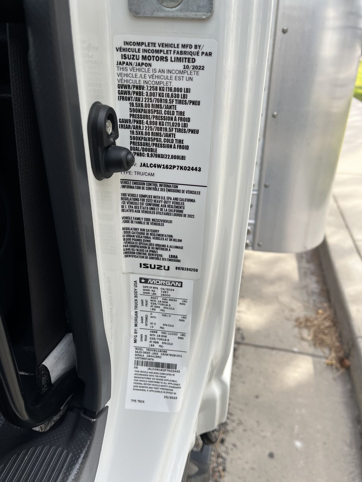 2023 Isuzu NPR XD, GVWR 16,000 lbs., fleet-maintained commercial cab-over box truck with 112,485 miles on the 4HK1-TC turbo-diesel engine and AISIN A465 6-speed automatic transmission. This truck is equipped with A/C, cruise control, power windows, power door locks, AM/FM/CD/MP3 stereo, rear back-up sonar and hydraulic brakes. The 16-foot Summit aluminum box measures 16 X 96W X 90H and is equipped with E-TRACK. The truck is equipped with a Maxon 2,000 lb. steel tuck under liftgate. Stock #47-7W97KN. (JALC4W162P7K02443)