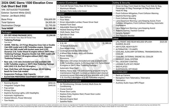 2026 GMC Sierra 1500 Elevation 4D Crew Cab Summit White EcoTec3 5.3L V8 4WD --- Please note that the final selling price does not include tax, tag, title, documentation fees, dealer-installed options, or pricing adjustments due to market demand. Financing through GM Financial is required for all discounts to be applied. Special finance offers may not be combined with some factory incentives. While we strive for accuracy, errors may occur, so please verify all information with a customer service representative. For the most accurate pricing, call us at (801) 265-1511 or visit our dealership in person. Prices and payments are subject to change based on manufacturer incentives. ... Sale Price may include dealer discount, $1500 - Buick GMC Bonus Cash $1750 - Buick & GMC Consumer Cash Program $3000 - GM Trade In Allowance Program