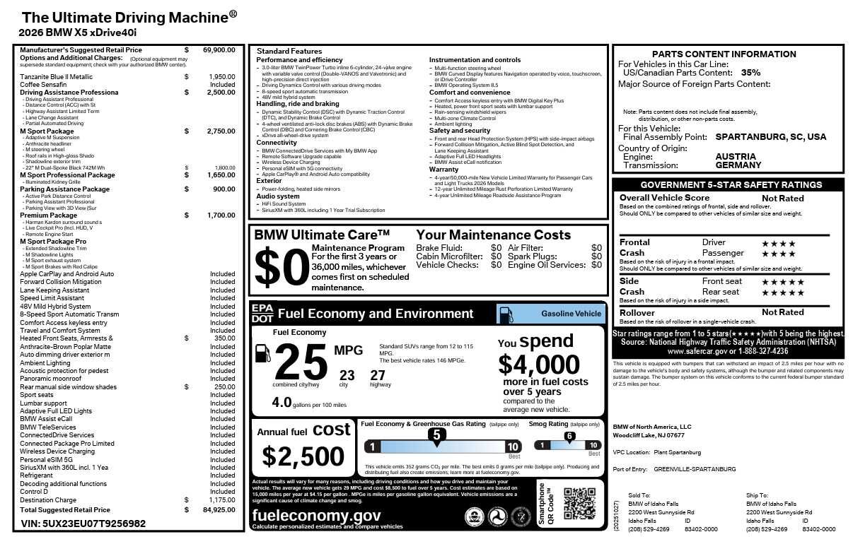 M SPORT PACKAGE: Wheels: 20 x 9 M Star-Spoke Bi-Color, Style 740M, Shadowline Exterior Trim, Adaptive M Suspension, M Steering Wheel, M Sport Package (337), Without Lines Designation Outside, High-Gloss Shadowline Roof Rails, Aerodynamic Kit, DRIVING ASSISTANCE PROFESSIONAL PACKAGE: Lane Change Assistant, Distance Control (ACC) w/Steering Assistant, Driving Assistant Professional, Partial Automated Driving, hands-free driving up to 85 mph on selected highways (8 years of service included), Highway Assistant Limited Term, WHEELS: 22 X 9.5 FR & 22 X 10.5 RR BLACK Style 742M, M dual-spoke, Tires: 275/35R22 Fr & 315/30R22 Rr, Staggered summer, Space-Saver Spare, Increased Top Speed Limiter, PREMIUM PACKAGE: Remote Engine Start, Live Cockpit Pro, HUD and video AR, harman/kardon® Surround Sound System, PARKING ASSISTANCE PACKAGE: automatic park assistant, backup assistant and trailer assistant, Parking Assistant Professional, Active Park Distance Control, side protection, Parking View w/3D View (Surround View), HEATED FRONT SEATS, ARMRESTS & STEERING WHEEL, SPORT SEATS (STD). BMW xDrive40i with Tanzanite Blue II Metallic exterior and Coffee interior features a Straight 6 Cylinder Engine with 375 HP at 5200 RPM*. Non-Smoker vehicle