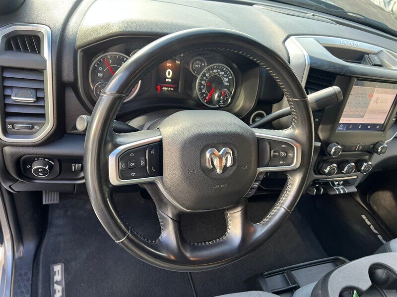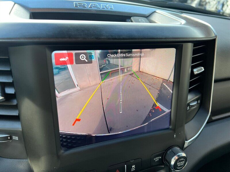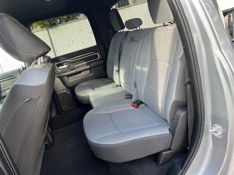 INSTALLED FEATURES: Air filtration, Front air conditioning, Front air conditioning zones: single, Rear vents: second row, Airbag deactivation: occupant sensing passenger, Front airbags: dual, Side airbags: front, Side curtain airbags: front / rear, Antenna type: mast, Auxiliary audio input: Bluetooth / jack / USB, Radio: AM/FM / touch screen display / voice operated, Radio data system, Speed sensitive volume control, Total speakers: 6, ABS: 4-wheel, Brake drying, Braking assist, Electronic brakeforce distribution, Emergency braking preparation, Front brake type: ventilated disc, Power brakes, Rear brake type: ventilated disc, Armrests: front center, Cargo area floor mat: rubber/vinyl, Dash trim: alloy, Door sill trim: scuff plate, Door trim: alloy, Floor mat material: rubber/vinyl, Floor material: carpet, Floor mats: front / rear, Steering wheel trim: urethane, Assist handle: front / rear, Cruise control, Cupholders: front, Multi-function remote: keyless entry / panic alarm, One-touch windows: 2, Overhead console: front, Power outlet(s): 12V front / USB front, Power steering, Power windows: lockout button, Push-button start, Reading lights: front, Rearview mirror: manual day/night, Steering wheel: tilt, Steering wheel mounted controls: cruise control / multi-function / phone / voice control, Storage: accessory hook / door pockets / under rear seats, Vanity mirrors: passenger illuminating, Active grille shutters, Door handle color: black, Front bumper color: chrome, Grille color: black / chrome surround, Headlight bezel color: chrome, Mirror color: black, Pickup bed light: tailgate illumination, Rear bumper color: chrome, Tailgate: power locking / removable, Window trim: black, Infotainment: Uconnect, Infotainment screen size: 5 in., Clock, Compass, Digital odometer, External temperature display, Fuel economy display: MPG / range, Gauge: tachometer, Instrument cluster screen size: 3.5 in., Multi-function display, Powertrain hour meter, Trip odometer, Warnings and reminders: low fuel level / low oil level / maintenance due, Daytime running lights, Headlights: auto delay off / auto on/off / halogen / quad headlights, Side mirror adjustments: manual folding / manual telescoping / power, Side mirrors: heated / integrated turn signals, Towing mirrors, 4WD selector: electronic hi-lo, 4WD type: part time, Alternator: 220 amps, Auxiliary oil cooler, Auxiliary transmission fluid cooler, Battery: maintenance-free, Battery rating: 730 CCA, Battery saver, Emissions: 50 state, Camera system: rearview, Check rear seat reminder, Child safety door locks, Child seat anchors: LATCH system, Crumple zones: front, Rearview monitor: in dash, Emergency locking retractors: front / rear, Front seatbelts: 3-point, Rear seatbelts: 3-point, Seatbelt force limiters: front, Seatbelt pretensioners: front, Seatbelt warning sensor: front, Driver seat manual adjustments: 4 / reclining, Front headrests: 2 / adjustable, Front seat type: 40-20-40 split bench, Passenger seat manual adjustments: 4 / reclining, Rear headrests: 3 / adjustable, Rear seat folding: folds up, Rear seat type: bench, Upholstery: cloth, Anti-theft system: vehicle immobilizer, Power door locks: auto-locking, Hill holder control, Roll stability control, Stability control, Traction control, Trailer stability control, Front shock type: gas, Front spring type: coil, Front stabilizer bar, Front suspension classification: solid live axle, Front suspension type: multi-link, Rear shock type: gas, Rear spring type: coil, Rear stabilizer bar, Rear suspension classification: solid live axle, Rear suspension type: multi-link, Suspension control: frequency selective, Electronic messaging assistance: voice operated / with read function, Hands-free phone call integration: voice operated, Wireless data link: Bluetooth, Pickup bed cargo management: tie-down anchors, Tow/Haul mode, Trailer brake controller, Trailer hitch: Class V, Trailer wiring: 4-pin / 7-pin, Spare tire mount location: underbody, Spare tire size: full-size, Spare wheel type: steel, Tire Pressure Monitoring System, Wheels: chrome clad, Front wipers: variable intermittent, Laminated glass: acoustic windshield, Power windows: safety reverse, Rear privacy glass, Solar-tinted glass