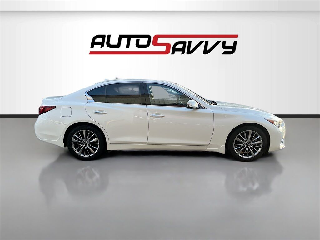 Discover the 2024 INFINITI Q50 LUXE AWD at AutoSavvy Woods Cross, a fusion of luxury and performance in a sleek sedan design. This certified 2024 model, finished in a stunning Majestic White, is powered by a formidable 3.0L V-6 twin-turbocharged engine delivering 300 horsepower, ensuring a dynamic driving experience. With just 25,777 miles, this vehicle promises long-lasting reliability. The interior is a sanctuary of comfort with Graphite leather upholstery, heated front seats, and a heated steering wheel. Advanced technology features include the INFINITI InTouch Dual HD Display System, a backup camera, and adaptive cruise control, keeping you connected and safe on every journey. The all-wheel-drive system and 7-speed automatic transmission enhance driving confidence in any condition. The current status of the title is branded, reflecting AutoSavvy's dedication to transparency and quality. This 2024 INFINITI Q50 is Savvy Certified, having undergone a rigorous inspection to ensure high standards of reliability and performance. Enjoy peace of mind with a 4-month/4,500-mile warranty, safeguarding your investment. Visit AutoSavvy Woods Cross today to explore this exceptional sedan, where luxury, technology, and peace of mind converge for an unparalleled driving experience. Whether you're navigating city streets or embarking on a long journey, the INFINITI Q50 LUXE AWD is poised to exceed your expectations.