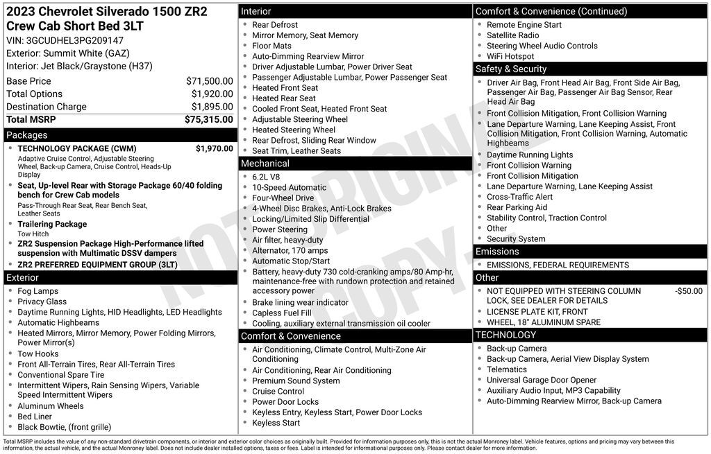 Summit White 2023 Chevrolet Silverado 1500 ZR2 4WD 10-Speed Automatic EcoTec3 6.2L V8 10-Speed Automatic, 4WD, Jet Black/Graystone Leather.
