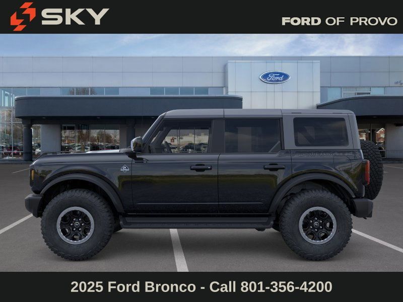 This 2025 Shadow Black Ford Bronco Outer Banks Advanced 4WD is well equipped and includes these features and benefits: 18'' Bright Machined Aluminum Wheels, 3.73 Axle Ratio, 4-Wheel Disc Brakes, 7 Speakers, ABS brakes, Air Conditioning, Alloy wheels, AM/FM radio: SiriusXM with 360L, AM/FM Stereo, Auto High-beam Headlights, Auto-dimming Rear-View mirror, Automatic temperature control, Brake assist, Compass, Connected Navigation, Delay-off headlights, Driver door bin, Driver vanity mirror, Dual front impact airbags, Dual front side impact airbags, Electronic Stability Control, Emergency communication system: 911 Assist, Exterior Parking Camera Rear, Front anti-roll bar, Front Bucket Seats, Front Center Armrest, Front dual zone A/C, Front fog lights, Front reading lights, Front wheel independent suspension, Fully automatic headlights, Heated door mirrors, Heated front seats, Heated Leather-Trimmed/Vinyl Bucket Seats, Heated steering wheel, Illuminated entry, Integrated roll-over protection, Internet access capable: FordPass Connect, Leather Shift Knob, Low tire pressure warning, Navigation system: Connected Navigation, Occupant sensing airbag, Outside temperature display, Overhead airbag, Overhead console, Panic alarm, Passenger door bin, Passenger vanity mirror, Power door mirrors, Power driver seat, Power passenger seat, Power steering, Power windows, Radio data system, Rear seat center armrest, Remote keyless entry, Security system, SiriusXM w/360L, Speed control, Split folding rear seat, Steering wheel mounted audio controls, SYNC 4, Tachometer, Telescoping steering wheel, Tilt steering wheel, Traction control, Trip computer, Variably intermittent wipers, and Voltmeter.