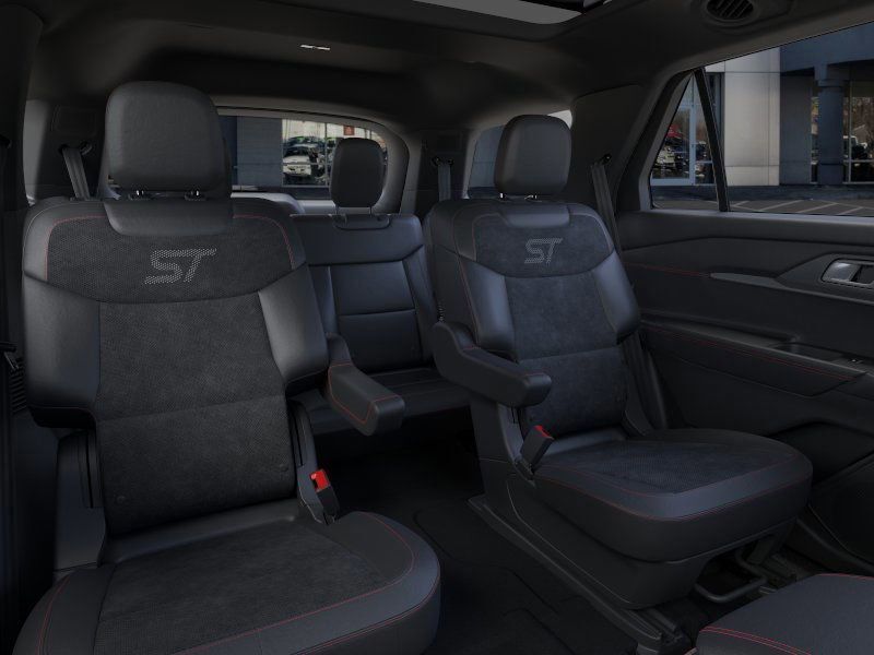 This 2026 Star White Metallic Tri-Coat Ford Explorer ST 4WD is well equipped and includes these features and benefits: 4WD, 10 Speakers, 3rd row seats: bench, 4-Wheel Disc Brakes, ABS brakes, Air Conditioning, Alloy wheels, AM/FM radio: SiriusXM with 360L, Apple CarPlay/Android Auto, Auto High-beam Headlights, Auto-dimming door mirrors, Auto-dimming Rear-View mirror, Automatic temperature control, Brake assist, Bumpers: body-color, Compass, Delay-off headlights, Driver door bin, Driver vanity mirror, Dual front impact airbags, Dual front side impact airbags, Electronic Stability Control, Emergency communication system: 911 Assist, Exterior Parking Camera Rear, Four wheel independent suspension, Front anti-roll bar, Front Bucket Seats, Front Center Armrest, Front dual zone A/C, Front fog lights, Front reading lights, Fully automatic headlights, Garage door transmitter, Heated door mirrors, Heated front seats, Heated rear seats, Heated steering wheel, Heated/Ventilated Miko Suede Captain's Chairs, Illuminated entry, Knee airbag, Leather steering wheel, Low tire pressure warning, Memory seat, Navigation System, Occupant sensing airbag, Outside temperature display, Overhead airbag, Overhead console, Panic alarm, Passenger door bin, Passenger vanity mirror, Power door mirrors, Power driver seat, Power Liftgate, Power passenger seat, Power steering, Power windows, Radio: B&O Sound System by Bang and Olufsen, Rain sensing wipers, Rear air conditioning, Rear anti-roll bar, Rear reading lights, Rear window defroster, Rear window wiper, Remote keyless entry, Security system, Speed control, Speed-sensing steering, Speed-Sensitive Wipers, Split folding rear seat, Spoiler, Sport steering wheel, Steering wheel mounted audio controls, Tachometer, Telescoping steering wheel, Tilt steering wheel, Traction control, Trip computer, Turn signal indicator mirrors, Variably intermittent wipers, Ventilated front seats, and Wheels: 21'' Magnetite-Painted Aluminum.