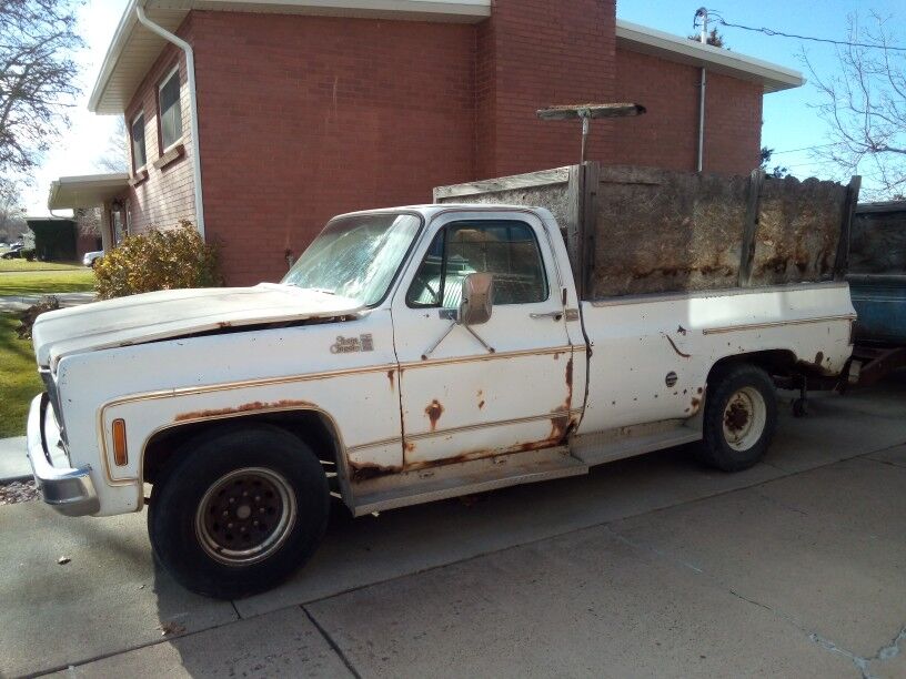 This is the Sierra Classic Camper Special with a 1973 Chevy 1/2 ton 350 eng, auto trans, drive shaft, & steering column. The truck was used by me daily for many years before I parked it in my driveway 11.5 yrs ago. So the eng/trans should still be good, although I have not started it since parking it. I think the fuel should be checked before attempting to start. I charged the bat, but will probably need to be replaced. The trans use to leak some, & the dist has new points. The bench seat upholstery is in excellent condition as its been reupholstered. Everything still works except the AC. Some work is needed to get it running, but afterwards it would be a good work truck that can handle heavy loads. Asking $1000 OBO.