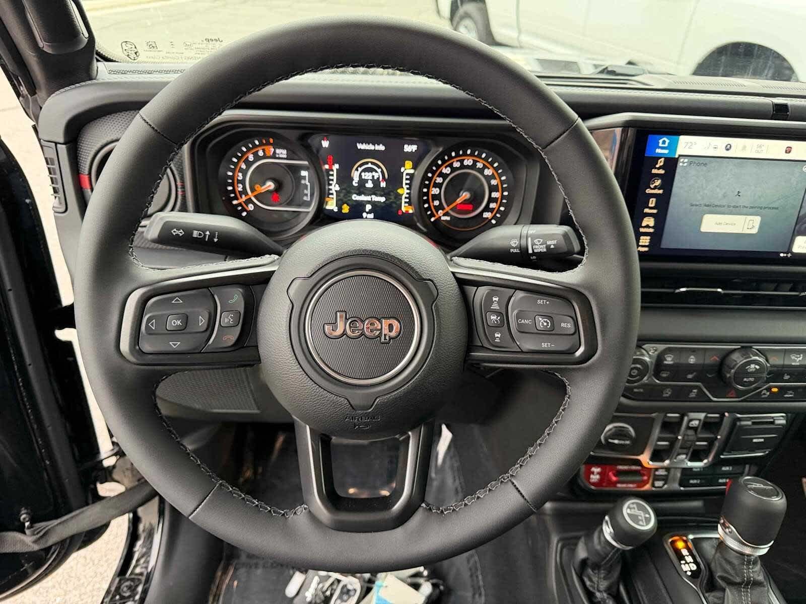 4x4, Back-Up Camera, Satellite Radio, iPod/MP3 Input, Onboard Communications System, Trailer Hitch, Aluminum Wheels, Dual Zone A/C, Apple CarPlay®, WiFi Hotspot. MP3 Player, Keyless Entry, Privacy Glass, Child Safety Locks. Jeep Rubicon with Black Clearcoat exterior and Black interior features a V6 Cylinder Engine with 285 HP at 6400 RPM*.