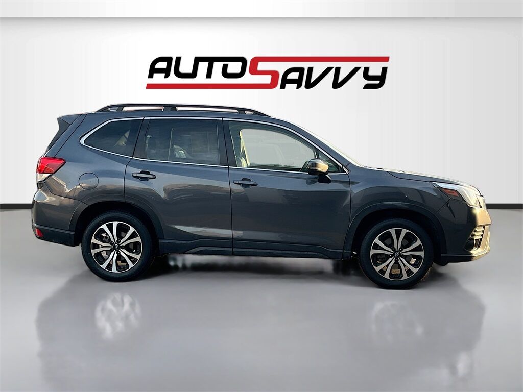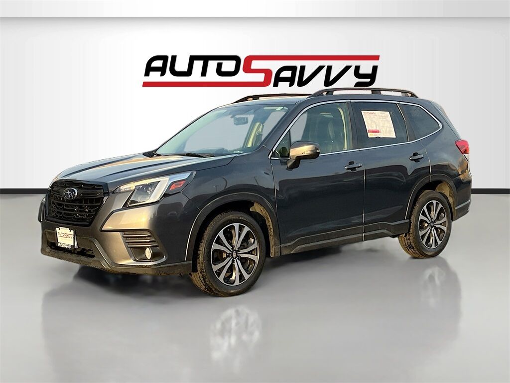 Uncover the 2022 Subaru Forester Limited at AutoSavvy Lindon, a meticulously designed sport utility vehicle that blends advanced technology with everyday practicality. This Magnetite Gray Metallic beauty is powered by a 2.5L H-4 engine, delivering 182 horsepower for a smooth and efficient drive, achieving up to 33 MPG on the highway. With only 532 miles, this Forester is practically brand new, offering a luxurious interior with leather upholstery and a suite of premium features including a panoramic sunroof, heated front seats, and a Harman/Kardon audio system. Stay connected with Apple CarPlay and Android Auto integration, while the all-wheel-drive system ensures confidence across all terrains. This 2022 Subaru Forester comes with a branded title, reflecting AutoSavvy's dedication to providing exceptional value without compromising on quality. Each vehicle undergoes a rigorous inspection to meet high safety and performance standards, ensuring peace of mind with every purchase. As a Savvy Certified vehicle, it is supported by our comprehensive 4-month/4,500 Mile Warranty, offering additional assurance and support. AutoSavvy Lindon is committed to delivering high-quality, low-mileage vehicles with premium features at significant savings. Join the community of savvy buyers who appreciate the unique benefits of purchasing from AutoSavvy. Visit AutoSavvy Lindon today to explore this outstanding Subaru Forester and experience the perfect blend of innovation, comfort, and cutting-edge technology.